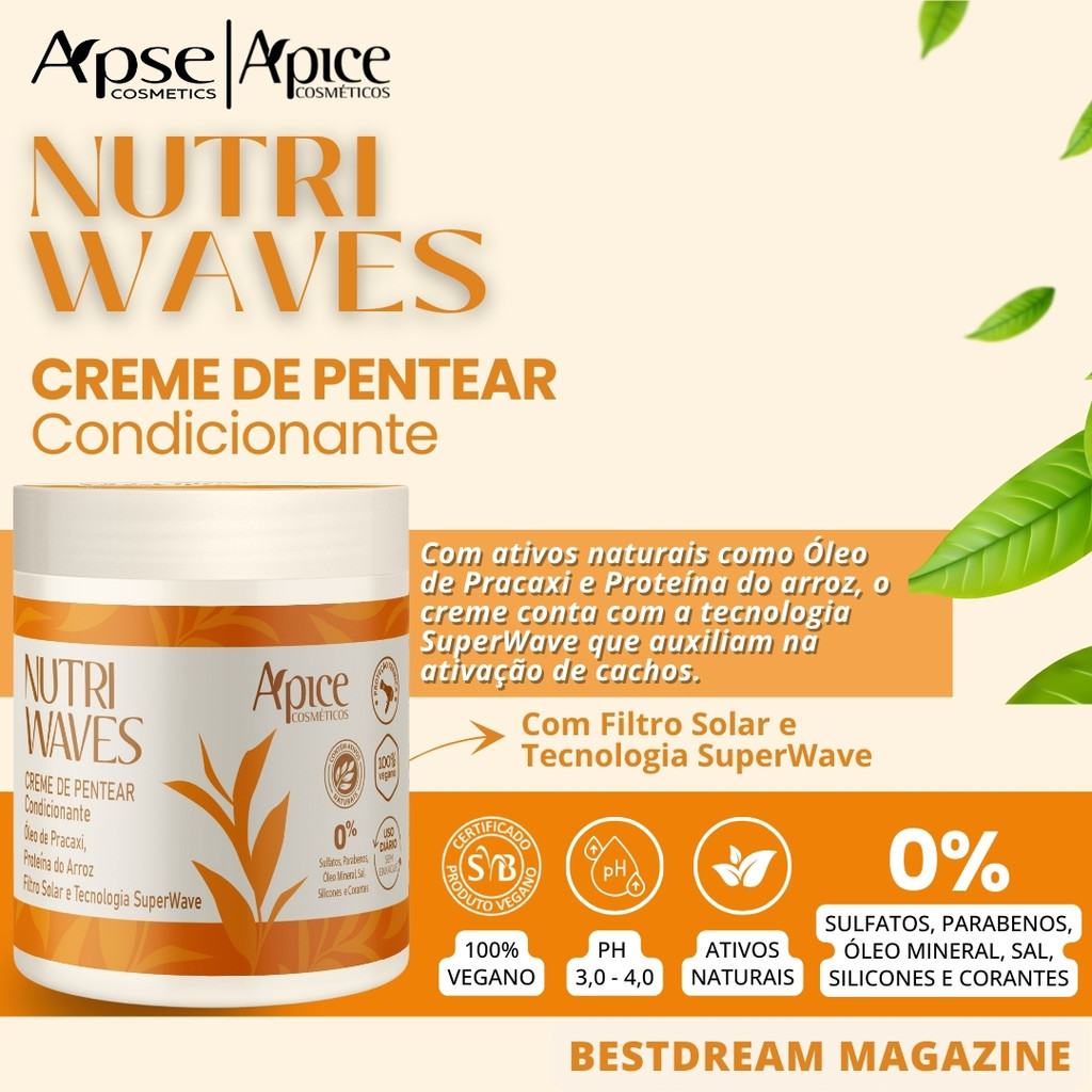 ENVIO IMEDIATO KIT NUTRI WAVES GELATINA 300ML + MÁSCARA 300G + CREME DE PENTEAR 500G - NOVA LINHA APICE COSMÉTICOS Linha completa com ingredientes tensoativos e biodegradáveis, que promovem a limpeza do couro cabeludo sem retirar a oleosidade naturais dos fios. Liberado para Low Poo. LINHA NUTRI WAVES ENRIQUECIDO COM: PROTEÍNA DO ARROZ: Rica em aminoácidos, adiciona brilho aos cabelos e melhora a elasticidade e resistência. Ação nutritiva, protetora remineralizantee antioxidante. Repara e fortalece a fibra capilar danificada por agentes externos. Diminui a carga de eletricidade estática dos cabelos. GELATINA E CREME DE PENTEAR NUTRI WAVES ENRIQUECIDA COM: ÓLEO DE PRACAXI: Contém nutrientes essenciais, como vitaminas E e K, que nutrem os cabelos, fortalecendo e melhorando sua saúde geral. Ajuda a suavizar a cutícula capilar e reduzir o frizz, deixando os cabelos mais disciplinados e com aspecto mais saudavel e brilhoso. - Dermatologicamente testado; - Não testamos em animais; - 0% Sulfatos, Parabenos, Óleo Mineral, Sal, Silicones e Corantes; - Indicado para todas as curvaturas. MODO DE USO: GELATINA Aplique a Gelatina Nutri Waves nos fios molhados ou secos, espalhe com pente ou técnica de sua preferência. Para mais definição, combine com o Creme de Pentear. Uso diário, sem enxágue. No day after, reative os cachos e quebre o durinho com sérum ou óleo vegetal. CREME DE PENTEAR Aplique o Creme de Pentear nas mechas, faça fitagem e modele os cachos. Deixe secar naturalmente ou use difusor. Para mais definição, finalize com a gelatina Nutri Waves. MASCARA Lave os fios com a linha Ápice, aplique a Máscara Nutri Waves, massageie e deixe agir por até 15 minutos. Enxágue, retire o excesso de água e finalize com o Condicionador Ápice para selar as cutículas. ESSE ANÚNCIO CONTÉM: 01x Gelatina Acidificante Nutri Waves Apice 300ml. 01x Máscara Nutri Waves Apice 300ml. 01x Creme de Pentear Condicionante Nutri Waves Apice 500g.