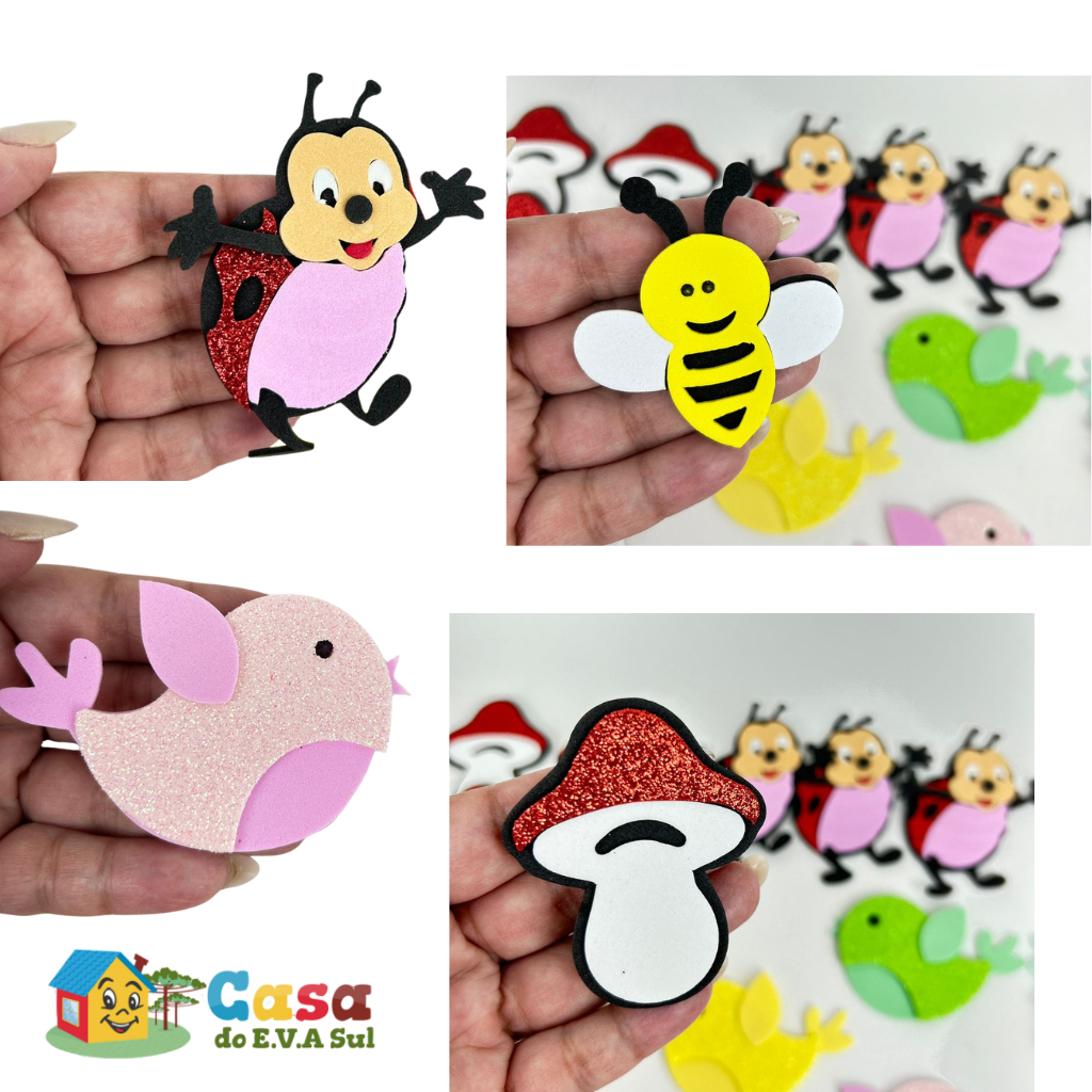 kit apliques de Eva jardim encantado APLIQUES pequenos media de tamanhos 3 Joaninhas 8cm x 7cm 6 abelhas 5,5cm x 5,0cm 5 Passarinhos 8cm x 5cm 6 Cogumelos 6cm x 5cm 20 Flores com glitter 3,5cm x 3,5cm 20 Borboletinhas 3cm x 3cm 20 Flores solzinho glitter 3,5cm x 3,5cm produtos a pronta entrega envios em ate 24h
