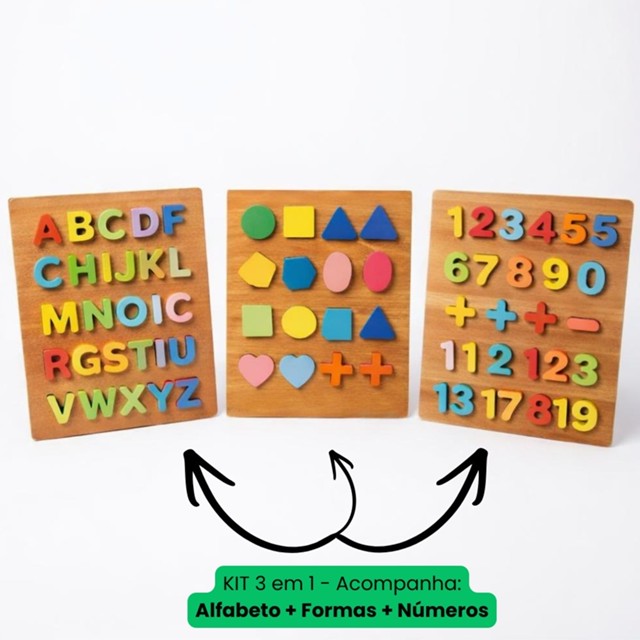 | Kit Aprenda Brincando Educativo 3 em 1 Madeira Alfabeto Números Formas este produto | R$ 37,90 | 42% | 4.9/5 | 57 |