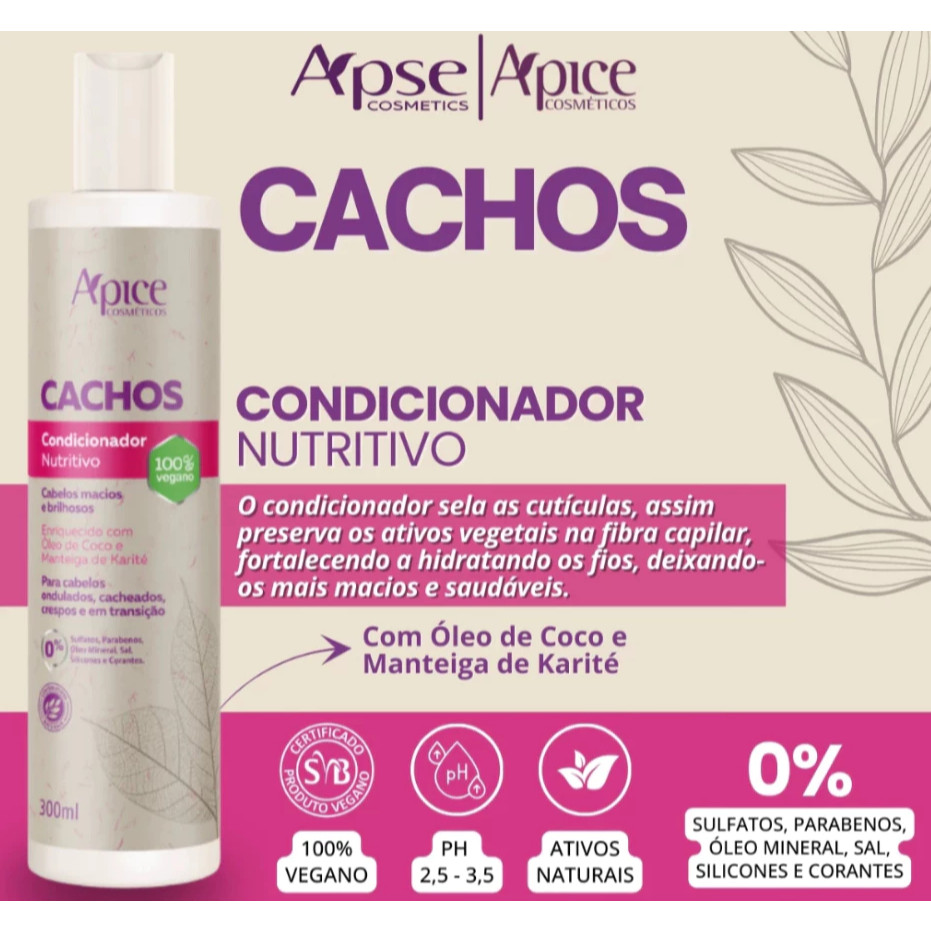 ESSE ANÚNCIO CONTEM: 01x Shampoo Cachos Apse 300ml 01x Condicionador Cachos Apse 300ml 01x Ativador Modelador Cachos Apse 500g # INFORMAÇÕES COMUM AOS 3 PRODUTOS • Uso Diário • Para cabelos ondulados, cacheados, crespos e em transição • 100% Vegano • Não é testado em animais • 0% de sulfatos, parabenos, óleo mineral, sal, silicones e corantes # SHAMPOO CACHOS NUTRITIVO APSE - 300ML • Este produto vai limpar, hidratar, deixando seus fios macios e saudáveis • Ph 5,50 a 6,40 aproximadamente - Enriquecido com: • D-Pantenol: Pró Vitamina B5, possui ação hidratante e trabalha para a manutenção da umidade natural dos cabelos. • Óleo de Coco: Rico em vitaminas, lipídios e proteínas. Excelente poder umectante e hidratante para os fios. • Extrato de Aloe Vera: Diminui irritação no couro cabeludo e hidrata os fios. # CONDICIONADOR CACHOS NUTRITIVO - 300ML - Sua hidratação deixa os cabelos macios e brilhosos, desenvolvendo o movimento natural dos cabelos. - Enriquecido com: • Manteiga de Karité: Agente emoliente com excelente ação de nutrição profunda para os fios, além de promover brilho e suavidade. • Óleo de Coco: Rico em vitaminas, lipídios e proteínas. Excelente poder umectante e hidratante para os fios. # ATIVADOR E MODELADOR DE CACHOS - 500G • Hidrata e desenvolve o movimento natural dos cabelos, formando cachos - Enriquecido com: • Óleo de Coco: Rico em vitaminas, lipídios e proteínas. Excelente poder umectante e hidratante para os fios. • Exclusiva Tecnologia SuperWave: Ativo vegetal rico em polissacarídeos extraídos da semente da linhaça e de chia. Essa combinação confere definição máxima aos cachos. - Como Usar: Após lavar e condicionar os cabelos, aplique nos cabelos molhados ou secos o Ativador com o auxílio de um pente ou utilizando a sua técnica de aplicação favorita. Não é necessário e enxaguar. Pode ser usado todos os dias.