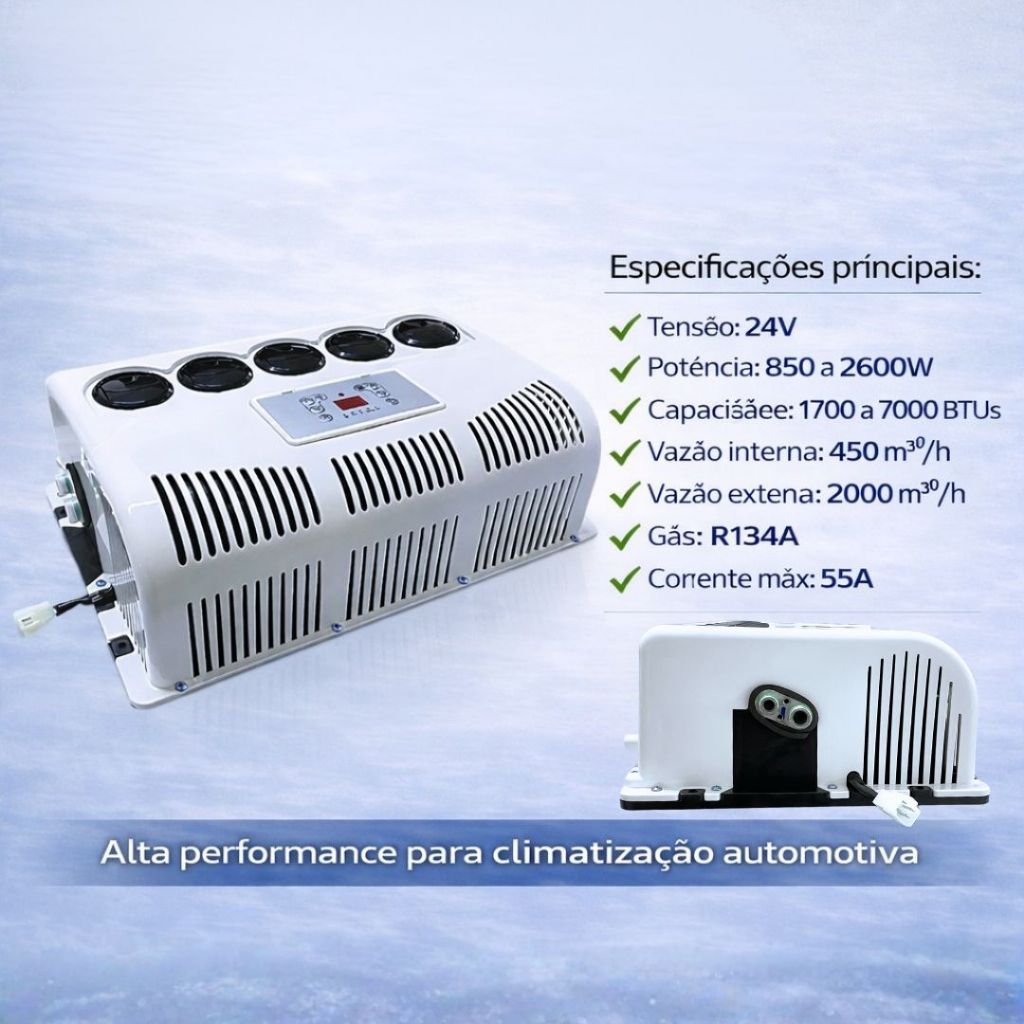 Kit Ar Condicionado Elétrico Compacto Lateral Caminhão Van MotorHome Trator Trailer Universal 24v **ATENÇÃO PRODUTO 24V** Marca: Maxfreeze Código: MAXMINI24V Características: - Cor: Branco; - Tensão (V): 24; - Conector: 2 Fios, Conector de 4 Pinos Macho, Conector de 4 Vias Fêmea; - Tipo de Onda: Inversor CC; - Óleo de Refrigeração: POEE68; - Gás Refrigerante: R134A; - Dimensão Superior (MM): 690X465X155; - Dimensão Inferior (MM): 450X310X146; - Consumo (W): 850 A 2600; - Consumo (BTUs): 1700 A 7000; - Tensão MÁXIMA (V): 30; - Corrente (A): 40; - Corrente Máxima (A): 55; - Volume de Ar Interno (M3/h): 450; - Volume de Ar Externo (M3/h): 2000; - Carga Necessária de Gás (G): 600±30; - FRIGORIAS HORA: 430 À 1720; - Local de Aplicação: Lateral; **Não Inclui Gás no Produto, precisa de primeira recarga Aplicação: Universal, Caminhões, Vans, MotorHome, Carros. Itens Incluso: - Controle Remoto; - Válvula de Expansão; - Parafusos Para fixação; - Suporte de Fixação; - Canos de 3,5 Metro (13mm e 8mm); - Ar Condicionado em 2 Peças (Split e Condensador); --------------------------------------- - A AMPEC AUTOPEÇAS não se responsabiliza pelo mau uso ou instalação indevida do produto, sempre recomendamos que a instalação seja feita por um profissional especializado. - O produto é novo ? Sim, não trabalhamos com produtos usados, remoldados ou remanufaturados. -Tem disponibilidade do produto ? Temos disponibilidade de todos nossos produtos enquanto durarem os estoques. -O produto vem com nota fiscal ? Sim, todos os nossos produtos acompanham nota fiscal. - Imagem ilustrativa utilizada para identificação e demonstração de produto. - As Marcas e Modelos citadas no anúncio, pertencem aos seus respectivos fabricantes, somente mencionadas como referências para o uso correto do produto, conforme artigo 31 da Lei: 8078 de 11.09.1990 * Não temos qualquer vínculo com estas empresas. Infelizmente não emitimos NF para revenda fora do estado do Paraná. Desculpe. Fora do estado atendemos apenas destinado a consumidor final.
