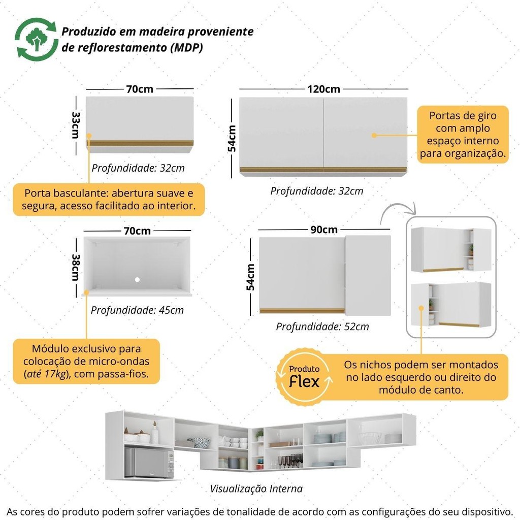 Realize o sonho de ter uma cozinha organizada, bonita e prática para viver momentos inesquecíveis com quem você ama! O Kit Armário Cozinha Modulada Aéreo Canto 230cm 6 Peças Veneza Multimóveis MP2296 foi criado para transformar seu lar com design moderno, funcionalidade e detalhes pensados para encantar. Elegância e durabilidade: O conjunto é produzido em madeira de reflorestamento (MDP 12/15mm) com acabamento acetinado (cerca de 20% de brilho), agregando sofisticação e leveza à sua cozinha. Material resistente, pensado para acompanhar sua família em todos os momentos, trazendo tranquilidade e conforto ao seu lar. Liberdade para criar seu espaço: São 6 módulos individuais, que permitem montagem personalizada conforme seu espaço e necessidade. Você escolhe a melhor disposição e torna seu ambiente único, do seu jeito! Aproveitamento inteligente: O armário aéreo de canto é flex: monte os nichos no lado esquerdo ou direito do móvel e otimize cada cantinho. Organização prática e eficiente: Possui 3 portas de giro com amplo espaço interno, para manter seus utensílios e mantimentos sempre organizados. As 3 portas basculantes contam com pistão a gás, abrindo suavemente e facilitando o acesso aos itens no dia a dia. Os puxadores alongados em ABS são modernos e práticos de manusear. Espaço especial para micro-ondas: Acompanha nicho específico para micro-ondas (até 17kg), agregando praticidade e deixando tudo ao alcance das suas melhores receitas. Conteúdo da Embalagem: 3 (três) Armários Aéreos 70cm 1 (um) Armário Aéreo de Canto 90cm 1 (um) Armário Aéreo 120cm 1 (um) Módulo para Micro-ondas Kit Ferragem Manual de Montagem Especificações Técnicas: Dimensões do Produto Montado - Altura: 71cm | Largura: 230cm | Profundidade: 242cm Material: MDP Acabamento: Acetinado Possui Espaço para Micro-ondas: Sim Quantidade Total de Portas: 6 Material dos Puxadores: ABS *Você pode consultar as medidas detalhadas na imagem técnica do produto. *As cores do produto podem sofrer variações de tonalidade de acordo com as configurações do seu dispositivo. Aqui na Loja Multimóveis, você pode concluir sua compra facilmente com toda segurança. A entrega é garantida e aqui você está em 1° lugar. Imagem meramente ilustrativa. Decoração e eletros não acompanham o produto. O produto será entregue desmontado e não disponibilizamos o serviço de montagem.
