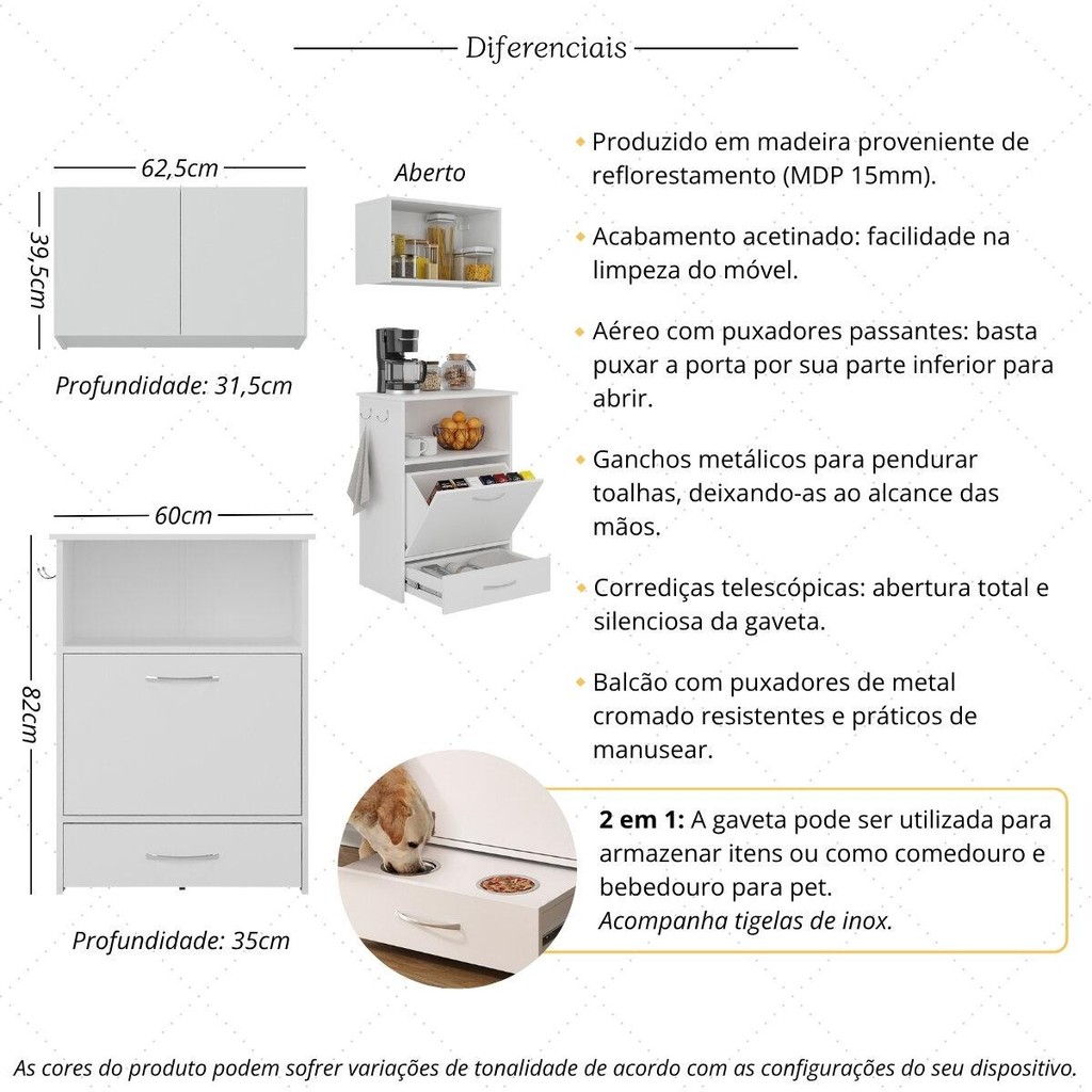 Combinando elegância e praticidade, o Kit Armário de Cozinha Aéreo 62,5cm com Balcão Multiuso Multimóveis MP5063 é a escolha ideal para quem deseja organizar e otimizar o espaço com estilo. Funcional e moderno, ele transforma sua cozinha em um ambiente mais bonito e eficiente. Durabilidade e sofisticação: Fabricado em MDP de 15mm com acabamento acetinado (cerca de 20% de brilho), este conjunto garante resistência e facilidade na limpeza. O armário aéreo de 2 portas facilita o acesso aos objetos guardados, tornando o dia a dia na cozinha muito mais prático. Funcionalidade e espaço generoso: O balcão possui 1 porta e 1 gaveta com corrediças telescópicas, que proporcionam abertura total e silenciosa. O rodízio abaixo da gaveta garante sua estabilidade e movimentação segura. Conta com um nicho (suporta até 6kg) e tampo (suporta até 7kg) para acomodar seus utensílios de cozinha e objetos decorativos, deixando o ambiente com a sua cara. Os 2 ganchos metálicos servem para pendurar toalhas e mantê-las ao alcance das mãos, enquanto os puxadores de metal cromado adicionam um toque prático ao móvel. Versátil, a gaveta pode ser utilizada para manter seus itens organizados ou transformada em comedouro e bebedouro para pet, acompanhando tigelas de inox. Conteúdo da Embalagem: 1 (um) Armário Aéreo 62,5cm 1 (um) Balcão Multiuso 60cm Manual de Montagem Kit Ferragem Especificações Técnicas: Armário Aéreo - Altura: 39,5cm | Largura: 62,5cm | Profundidade: 31,5cm Balcão - Altura: 82cm | Largura: 60cm | Profundidade: 35cm Material: MDP 15mm Acabamento: Acetinado Corrediças: Telescópicas Material do Puxador: Metal cromado *Você pode consultar as medidas detalhadas na imagem técnica do produto. *As cores dos produtos podem sofrer variações de tonalidade de acordo com as configurações do seu dispositivo. *Obrigatório fixar os produtos na parede. Aqui na Loja Multimóveis, você pode concluir sua compra facilmente com toda segurança. A entrega é garantida e aqui você está em 1° lugar. Imagem meramente ilustrativa. Decoração e eletros não acompanham o produto. Os produtos serão entregues desmontados e não disponibilizamos o serviço de montagem.