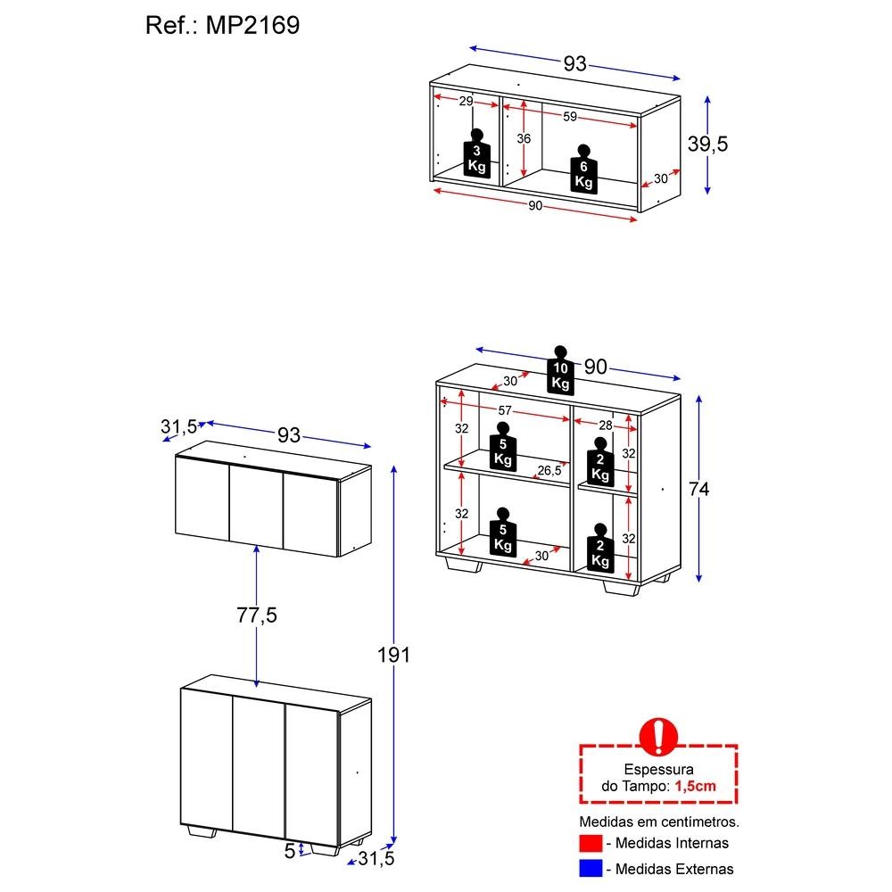O Kit Armário de Cozinha Aéreo e Balcão 3 Portas Multimóveis MP2169 é perfeito para quem busca praticidade e organização no ambiente culinário. Fabricado em MDP (15mm) com acabamento acetinado (cerca de 20% de brilho), garante durabilidade e resistência. Composto por um balcão e um armário aéreo com 3 portas e prateleiras, oferece amplo espaço interno para organizar todos os utensílios de cozinha de forma prática. O balcão ainda possibilita apoiar os itens mais utilizados no dia a dia, mantendo tudo sempre à mão na hora de preparar suas receitas favoritas. Com design clean que confere um visual moderno e sofisticado, este kit combina perfeitamente com qualquer tipo de decoração. Os pés quadrados em polipropileno oferecem estabilidade e estilo único ao móvel. Conteúdo da Embalagem: 1 (um) Balcão 1 (um) Armário Aéreo Manual de Montagem Kit Ferragem Dimensões do produto montado: Armário Aéreo - Altura: 39,5cm | Largura: 93cm | Profundidade: 31,5cm Balcão - Altura: 74cm | Largura: 90cm | Profundidade: 31,5cm *Você pode consultar as medidas detalhadas na imagem técnica do produto. *As cores do produto podem sofrer variações de tonalidade de acordo com as configurações do seu dispositivo. Imagem meramente ilustrativa. Decoração e eletros não acompanham o produto. O produto será entregue desmontado e não disponibilizamos o serviço de montagem.