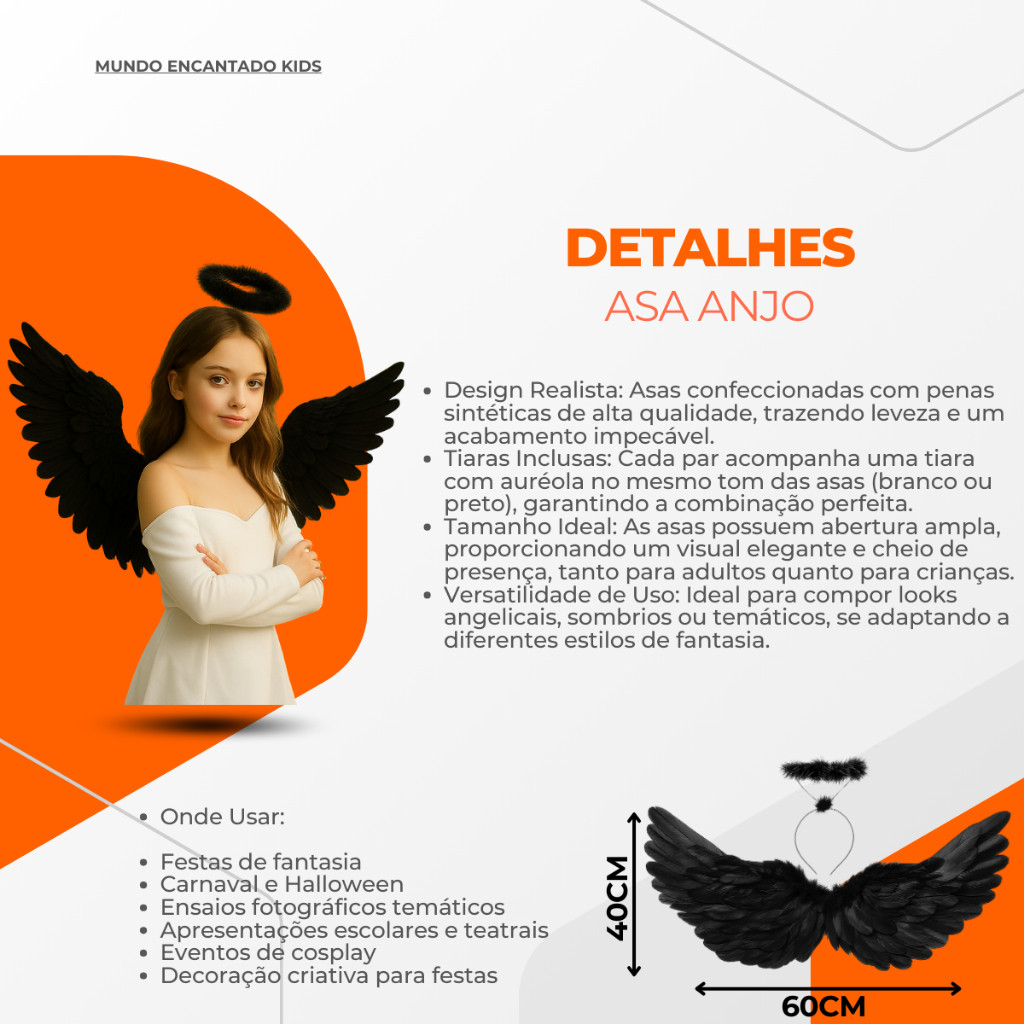 Kit Asa Anjo Fantasia Halloween Carnaval Festa Cosplay Com Tiara Preto Branco Pena Plumas