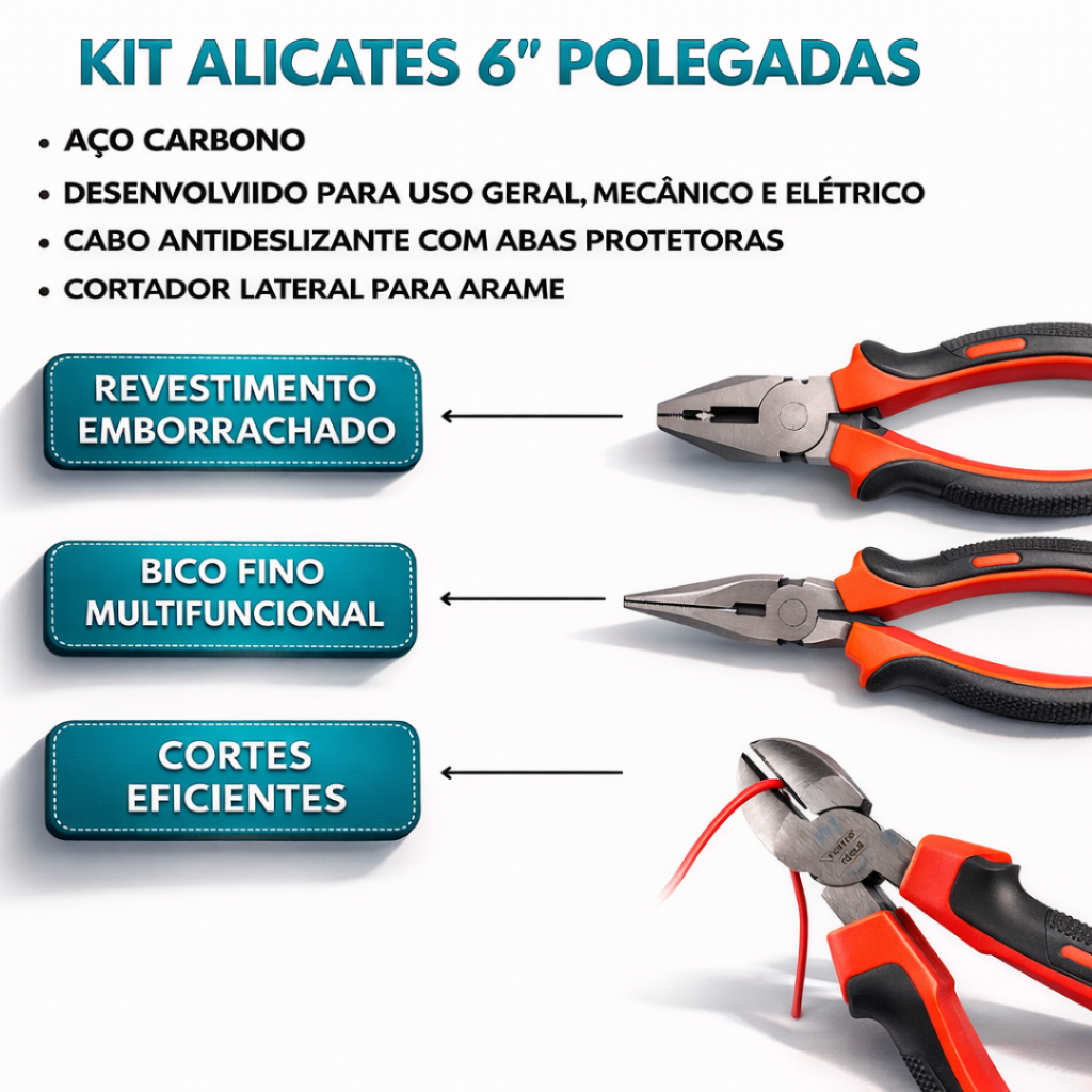 Kit Até 03 Alicate Universal 6" Polegadas Multiuso Emborrachado Profissional Bico ferramentas Fino Corte