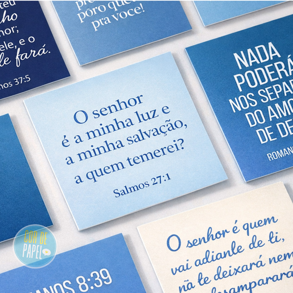 💙🙏 MINI CARTÕES BÍBLICOS – SALMOS E VERSÍCULOS | 5x5 CM 🙏💙 🚫 Não Personalizamos nem editamos informações, produto a pronta entrega. Leve a Palavra de Deus para o dia a dia com estes mini cartões bíblicos delicados e inspiradores 📖✨ Perfeitos para transmitir fé, esperança, confiança e amor através de versículos que fortalecem o coração 💙🌿 📖 VERSÍCULOS PRESENTES NOS CARTÕES Os cartões contêm mensagens bíblicas conhecidas e cheias de significado, como: ✨ “O Senhor é a minha luz e a minha salvação; a quem temerei?” 📖 Salmos 27:1 ✨ “Entrega o teu caminho ao Senhor; confia nele, e o mais ele fará.” 📖 Salmos 37:5 ✨ “Nada poderá nos separar do amor de Deus.” 📖Romanos 8:39 ✨ “O Senhor é quem vai adiante de ti; não te deixará nem te desamparará.” 📖 Deuteronômio 31:8 🎨 DESIGN E CORES 💙 Tons suaves e elegantes de azul. ✨ Fundo liso e clean, valorizando a leitura 🖋️ Tipografias modernas e delicadas 🌿 Estilo minimalista, ideal para qualquer ocasião religiosa 📏 INFORMAÇÕES DO PRODUTO 📐 Tamanho: 5 x 5 cm 📄 Papel: Couchê 250g – encorpado, resistente e de alta qualidade 🖨️ Impressão: nítida, com excelente acabamento 📦 Produto: PRONTA ENTREGA 🚫 Personalização: NÃO personalizável