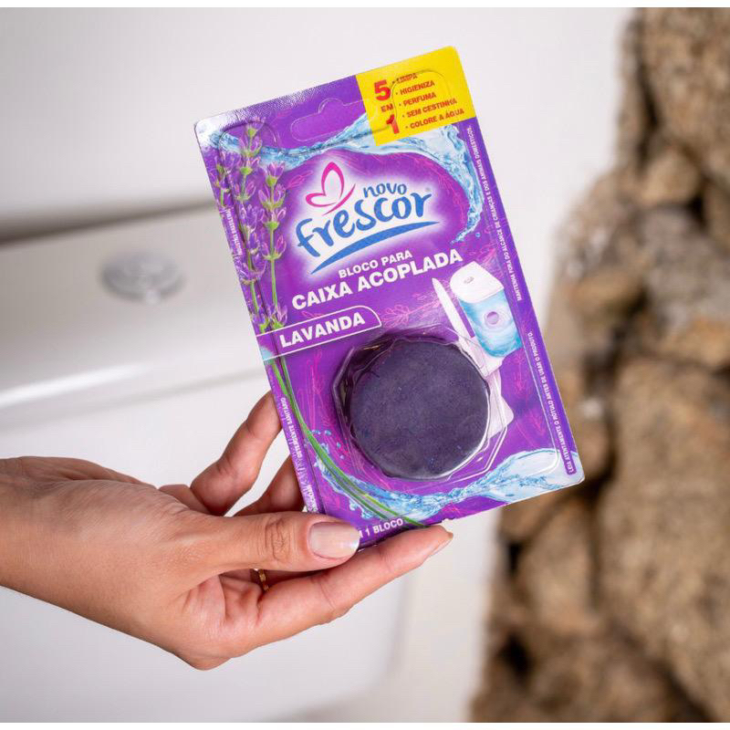 BLOCO SANITÁRIO PARA CAIXA ACOPLADA 45 GRAMAS O Bloco Sanitário Para Caixa Acoplada da Novo Frescor é para quem gosta de praticidade, limpeza e perfume duradouro. Os agentes de espuma e limpeza do Bloco para Caixa Acoplada Novo Frescor liberam um agradável perfume, descarga após descarga, por algumas semanas. Use regularmente para manter o banheiro cheiroso e o vaso sanitário limpo e brilhante. A aplicação do Bloco Sanitário para Caixa Acoplada é simples e rápida. Basta colocar um bloco dentro da caixa acoplada e deixar que ele faça o trabalho pesado. Sua fórmula inteligente é liberada a cada acionamento da descarga, proporcionando um alto poder de limpeza contínua e eficaz. INSTRUÇÕES DE USO 1 - Retire o bloco da embalagem plástica. 2 - Abra a tampa da caixa acoplada, em seguida insira o bloco Novo Frescor posicionando o produto longe da saída de água. 3 - Recoloque a tampa da caixa acoplada e aguarde 10 minutos para acionar a descarga. 4 - Quando a coloração da água diminuir, coloque outro Bloco para Caixa Acoplada Novo Frescor.