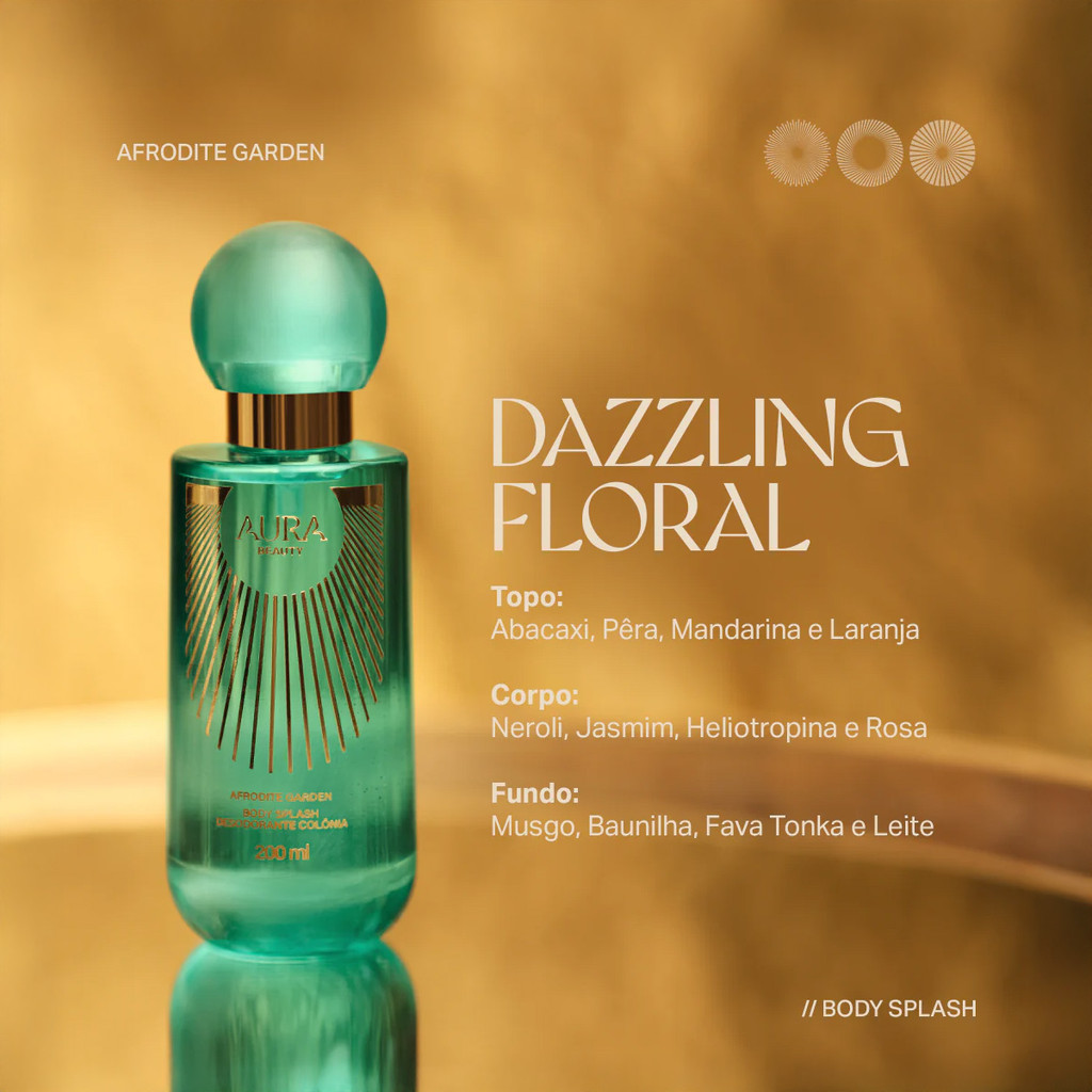 Kit Aura Beauty Afrodite Garden - Brilho, Perfume e Hidratação em Dobro Este Kit Contém Aura Beauty Afrodite Garden - Body Splash Desodorante Colônia 200ml: envolva-se na fragrância floral e refrescante que traduz a essência da deusa Afrodite. Com notas vibrantes de laranjeira e jasmim, o body splash perfuma a pele com leveza, sensualidade e sofisticação. Aura Beauty Magic Butter Afrodite Garden - Manteiga Iluminadora Corporal 200g: nutrição intensa com efeito iluminador. Enriquecida com manteiga de karité, vitamina E e ativos emolientes. Hidrata profundamente e realça o brilho natural da pele. Textura cremosa, toque macio e fragrância floral suave, para uma pele radiante e perfumada. Conselho de Aplicação Body Splash: aplique no corpo sempre que desejar. Recomendamos reaplicação ao longo do dia para manter a perfumação e frescor renovado. Manteiga Corporal: aplique sobre o corpo, principalmente nas áreas mais secas, espalhando suavemente até completa absorção e radiância homogênea.