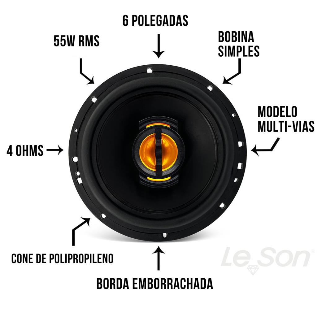 Mais de 15 anos de experiencia no mercado com os melhores produtos e o melhor atendimento! KIT 2 PARES DE ALTO-FALANTES 5 POLEGADAS E 6 POLEGADAS 55W 4 OHMS LESON Kit com 4 alto falantes no total, perfeito para turbinar o som do seu carro, deixando a reproducao das musicas com alto desempenho. Desenvolvido no modelo da marca Le Son, o kit contem 2 alto falantes de 5 polegadas e 2 alto falantes de 6 polegadas, atingindo uma potencia de ate 220W RMS. Com design moderno, esse kit de alto falantes e o que falta para o seu carro! Especificacao Tecnica: - Potencia RMS: 55 Wrms (cada alto-falante) - Impedancia Nominal: 4 ohms - Woofer de 5 Polegadas - Material: Cone Polipropileno PP - Tipo de falante: Multi-vias (Woofer + Tweeter) - Borda emborrachada - Sensibilidade: 87 Db - Resposta de frequencia: 37 Hz a 20 Khz - Tweeter Piezzo - Bobina Simples Peso: 280g (cada) Dimensoes do falante: - Diametro do falante: 11 cm - Altura: 13 cm - Largura: 13cm - Comprimento total: 6 cm - Comprimento interno: 4,5 cm - Largura da furacao: 10 cm Especificacao Tecnica: - Potencia RMS: 55 Wrms (cada alto-falante) - Impedancia Nominal: 4 ohms - Woofer de 6 Polegadas - Material: Cone Polipropileno PP - Tipo de falante: Coaxial (Woofer + Tweeter) - Borda emborrachada - Sensibilidade: 87 Db - Resposta de frequencia: 37 Hz a 20 Khz - Tweeter Piezzo - Bobina Simples Peso: 296g (cada) Dimensoes do alto-falante: - Diametro do falante: 14 cm - Altura: 16,5 cm - Largura: 16,5 cm - Comprimento total: 6 cm - Comprimento interno: 4,5 cm - Largura da furacao: 15 cm Exemplos de carros; Gm: Astra 4p 2000 Agile Blazer Corsa Corsa Novo Hatch 2002 acima Cobalt Montana Sonic Prisma ate 2013 Vectra 1997 em diante Vectra novo Zafira Fiat: Bravo Idea Palio a partir de 2000 Palio ate 2000 e Young c/ bolsa Palio Weekend 2001 Palio Weekend ate 2013 Punto Uno - sem bolsa Strada Peugeot: 206/ 207 / 208 / 307 / 308 Renault: Megane Toyota: Etios Vw: Gol 4p G2/ G3 / G4 Gol 4p G5 Novo Citroen: C3, Picasso, Air Cross, Xsara Hatckback, Xsara Coupe 3p, Xsara Perua Audi: A4, A6 Mitsubishi: Lancer Entre outros. Conteudo da Embalagem: 2 alto falantes de 5 polegadas + 2 alto falantes de 6 polegadas.