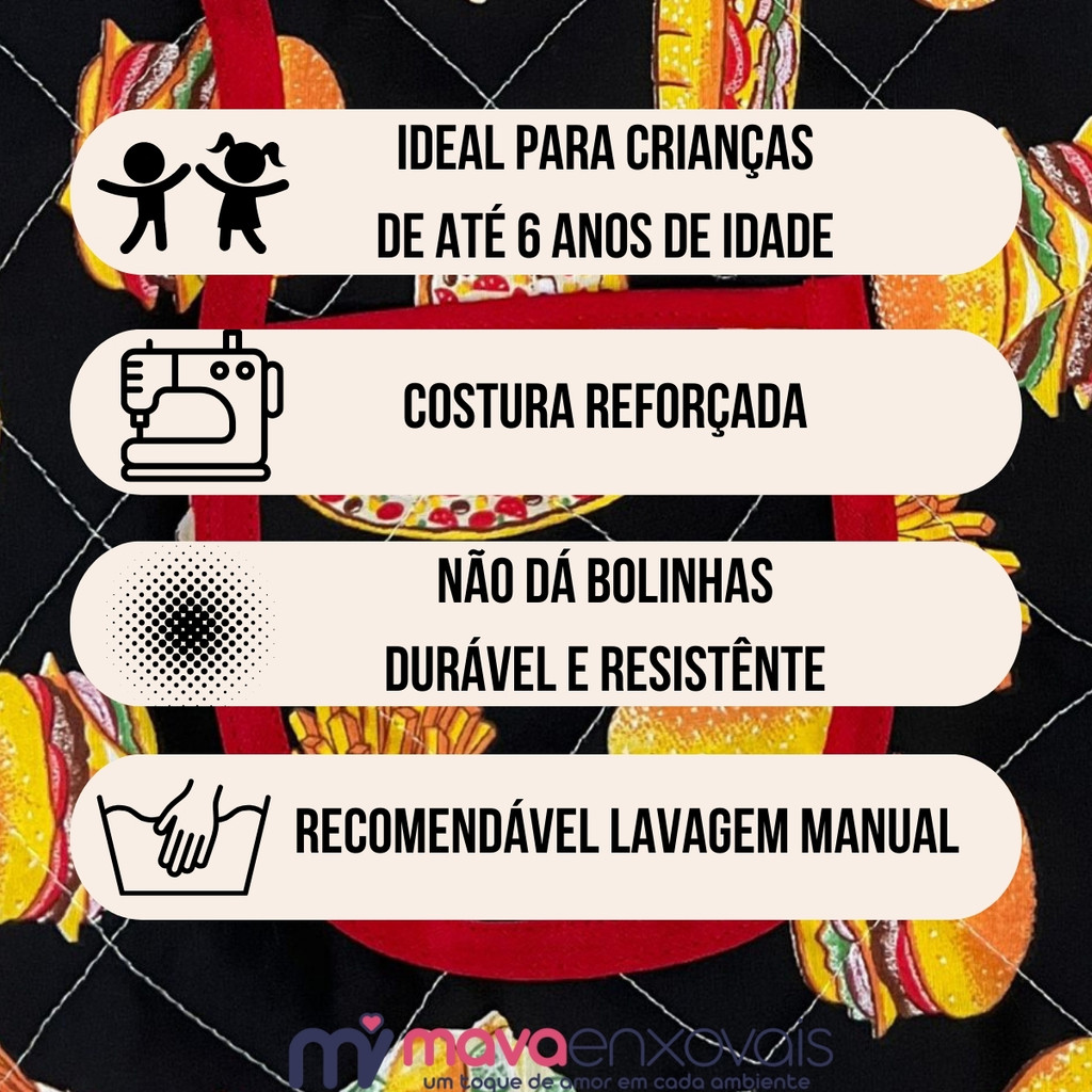 Kit Avental Infantil com Touca – Temático, Divertido e Seguro Deixe a hora de cozinhar ainda mais divertida para os pequenos! Nosso Kit Avental Infantil é completo e pensado para crianças de até 6 anos, trazendo segurança, conforto e muita fofura. O kit contém: Avental estampado com temas de cozinha e animais Touca Mestre Cuca para dar aquele charme especial Amarração ajustável na cintura para melhor encaixe Diferenciais: Acabamento em viés para maior durabilidade Forro impermeável no avental, que evita manchas e facilita a limpeza Estampas alegres e criativas que encantam crianças e adultos Composição: Tecido Tricoline 100% Algodão (Matelado na Linha) Ideal para: Momentos de brincadeira na cozinha Atividades escolares e recreativas Presentes criativos e úteis ATENÇÃO: Produtos semi - artesanal, Fabricado no Brasil; Somente lavagem manual; Não usar alvejante à base de cloro; Proibido usar secadora; Não limpar a seco. ATENÇÃO: A TONALIZADE DOS PRODUTOS PODERAM VARIAR.