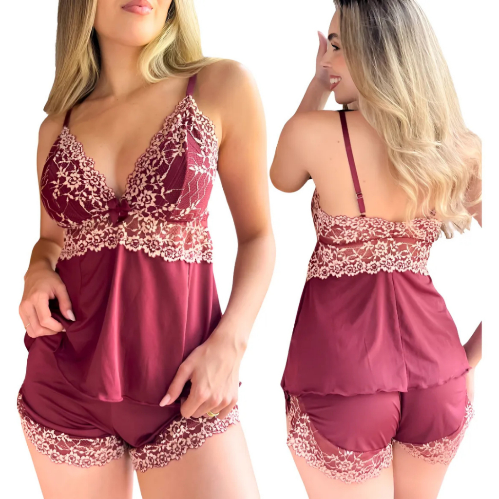 Kit Baby Doll Renda Bicolor Pijama Short e Blusinha em Suede Confortavel e Fresquinho