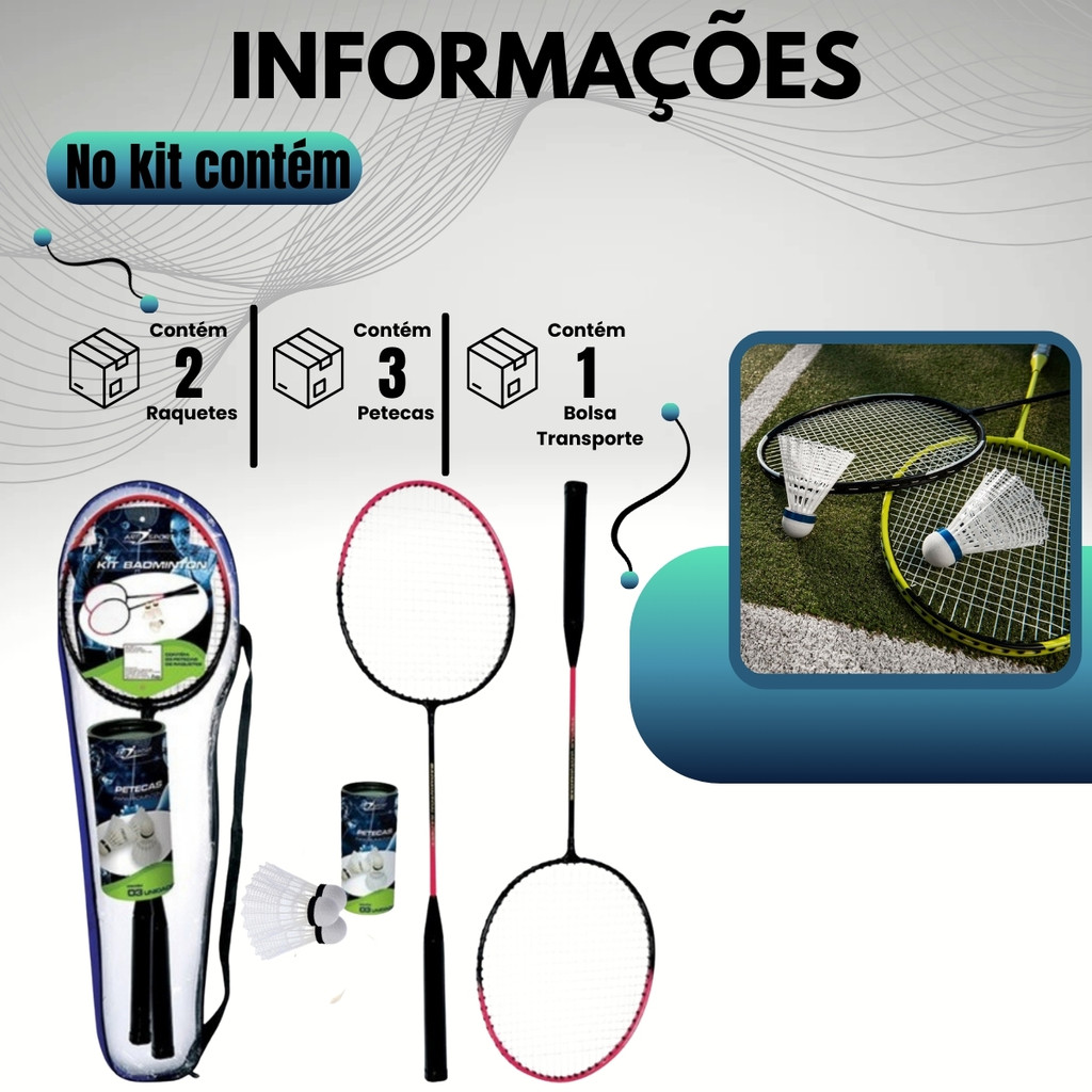 ***SEJA BEM VINDO A LOJA INTEGRA X***_x000d_ **ENVIO FEITO EM ATÉ 24h ÚTEIS APÓS A CONFIRMAÇÃO DO PAGAMENTO**_x000d_ _x000d_ O Badminton é um esporte divertido, dinâmico e perfeito para todas as idades! Ideal para quem quer se movimentar, brincar em família, praticar atividades ao ar livre ou até treinar de forma mais séria, esse jogo é uma excelente opção para unir lazer, saúde e diversão em um só produto._x000d_ _x000d_ Com raquetes leves e fáceis de manusear, o badminton é um jogo que pode ser praticado em diversos ambientes, como quintal, praia, parque, campo, escola ou até em áreas abertas de casa. Além disso, é uma ótima alternativa para estimular a coordenação motora, reflexos, agilidade e concentração._x000d_ _x000d_ O volante (peteca) foi feito especialmente para ter um voo estável, tornando a brincadeira mais fluida e emocionante, seja para iniciantes ou para quem já conhece o esporte._x000d_ _x000d_ Principais Benefícios_x000d_ _x000d_ Diversão garantida para crianças e adultos_x000d_ _x000d_ Ideal para atividades ao ar livre_x000d_ _x000d_ Ajuda a desenvolver coordenação motora e reflexos_x000d_ _x000d_ Estimula agilidade, concentração e equilíbrio_x000d_ _x000d_ Ótimo para brincar em dupla ou em grupo_x000d_ _x000d_ Excelente opção de presente_x000d_