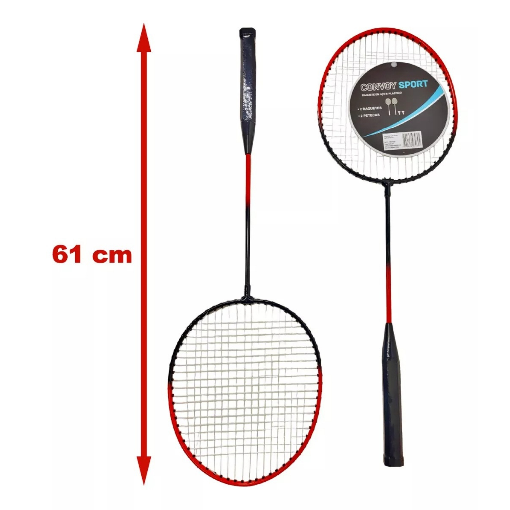 O kit de Badminton inclui 2 raquetes em metal com proteção no cabo e 2 petecas de borracha. Ideal para prática de Badminton, auxiliando o desenvolvimento da coordenação motora e a saúde do sistema cardiovascular. Chame seus amigos e curta uma praia ou piscina com uma partida de Badminton. Características: - Raquete de Badminton para iniciantes encordoada - É ideal para jogadores iniciantes e vai proporcionar segurança e diversão nas partidas. Informações Técnicas: - Tamanho: 65cm x 20cm Itens inclusos: 2 Raquetes e 1 Peteca + Bolsa de Transporte.