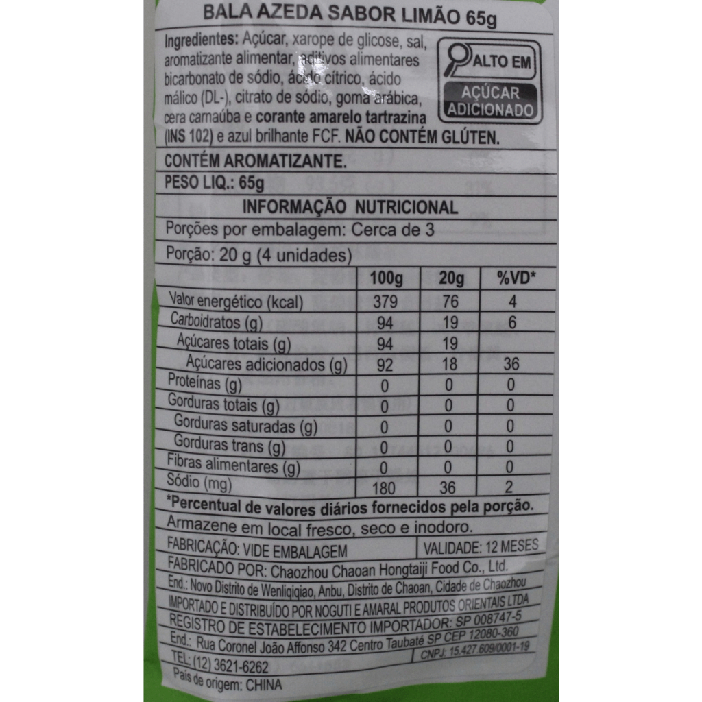 A bala super azeda sabor limão é diferente das balas tradicionais, pois inicialmente o seu sabor é extremamente azedo e após alguns segundos seu sabor muda completamente, tornando-se doce e ao mesmo tempo suave com o delicioso sabor de limão. Características: Ingredientes: Açúcar branco, xarope de glicose, sal, aditivos alimentares ( bicarbonato de sódio, ácido cítrico, ácido DL málico, citrato de sódio, goma arábica, cera de carnaúba, armaranto, azul brilhante), aromas alimentares. Embalagem: Contendo um kit com 3 pacotes de bala azeda da Hong Tai kee sabor limão com 65 gramas (cada). Sabor: Limão Origem: China Fabricante: Hong Tai Kee