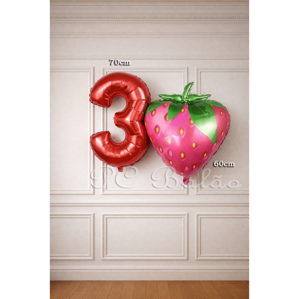 Kit Balão Metalizado 1 MORANGO 60CM + 1 Número 70CM VERMELHO FESTA FRUTAS AIVERSÁRIO MORANGUINHO