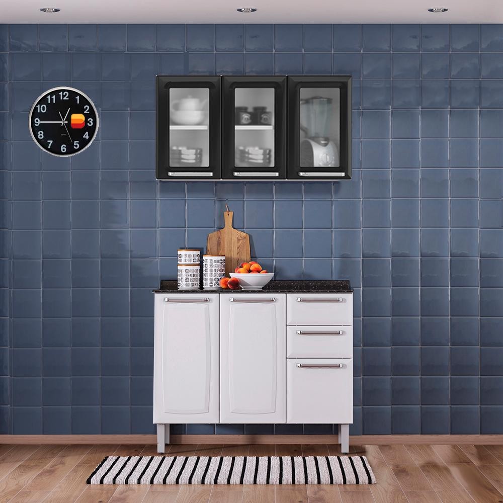 Kit Balcão 3 Portas 2 Gavetas Branco com Armário Aéreo 3 Portas 3 Vidros Preto Itatiaia Luce