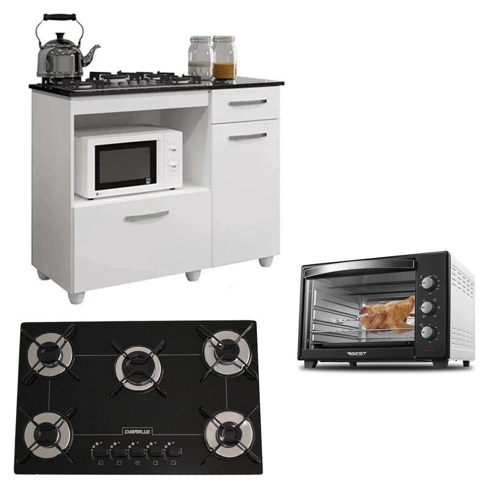 Balcão Cooktop Violeta Basculante P/ Fogão 5 Bocas - kaiki Móveis Otimize o espaço da sua cozinha com Balcão Cooktop, orgaanize os seus utensílios mais utilizados durante o dia. Dê um toque especial em sua cozinha com esse versátil e charmoso. Descrição: Espaço para cooktop com quantas bocas: 5 bocas Altura:92 cm Largura:114 cm Profundidade:49 cm; Espaço para forno elétrico: AxLxP 37 x 67 x 40cm Material da estrutura: MDP 15 mm, Material do tampo: MDP 18 mm, Material do fundo: MDP 3mm, Acabamento: U.V, Escala de Brilho: Brilho; Quantidade de Portas: 2 Portas; Quantidade de gavetas: 1 Gaveta; Quantidade de prateleiras: 1 Prateleira; Tipo de puxador: Externo plástico reforçado; Tipo de corrediça: Metálica; Quantidade de pés: 6; Tipo de pé: Fixo; Material do pé: Plástico reforçado; Tipo de dobradiça: Pistão a gás e metálica; Altura do pé: 6 cm; Possui vidro: Não; Possui regulagem de altura: Não; Possui opção de montagem inversa: Não; Possui espelho: Não. Recomendações de limpeza e manutenção: Limpeza com pano umedecido. Não aplicar lustra móveis. Peso máximo que suporta: distribuído 15 kg por prateleira e 5 kg por gaveta. Necessita de montagem: Sim; Complexabilidade da montagem: Média; Garantia: 6 meses. Forno Elétrico 48 Litros C/ Espeto Giratório - Best A capacidade de 48 litros permite variados formatos e tamanhos de fôrmas e travessas. Excelente opção para o preparo de pizzas, tortas, bolos, assados, pães, carnes e outras receitas, utilizando menos gordura e conservando os nutrientes do alimento. A temperatura de 0°C até 250°C possibilita maior controle na hora de assar os alimentos, pois é possível deixá-los no ponto ideal de acordo com cada receita: grelhado, gratinado e dourado a seu gosto. Através da porta em vidro temperado é possível visualizar o alimento durante o processo de preparo, além de oferecer mais resistência ao calor. Ainda conta com espeto giratório para preparação de alimentos mais elaborados, pegador de espeto giratório e pegador de grade e ndeja. Mais segurança e facilidade para você. Seu assado mais bonito para levar à mesa e bem mais gostoso. Características técnicas Modelo Forno 48 Litros Plus Potência 1600 W / 2000 W Consumo 1,6 Wh / 2,0 Wh Medidas (LxAxP) 560x350x410 mm Peso 10 Kg Garantia 1 ano Funções Assa, grelha, tosta, gratina e aquece. Acessórios Grelha, pegador em aço inox e bandeja coletora de gordura. Fogão Cooktop ultra chama 5 bocas Preto - Chamalux Dimensões do produto Altura: 10 cm Largura: 68,5 cm Profundidade:46 cm Dimensões do Nicho Altura: 10 cm Largura: 59,5 cm Profundidade:40 cm Principais características: Classificação A Queimadores Esmaltados 04 Queimadores semirrápidos 1750w 01 Queimador ultrarrápido 2200w Trempe esmaltada com sistema de encaixe mais segurança e facilidade na limpeza Mesa de Vidro Temperado Acendimento Inteligente Botões de Fácil Manuseio Bivolt *Não oferecemos o serviço de montagem de nossos produtos, a montagem fica por conta do comprador e não nos esponsabilizamos por falhas na montagem dos mesmos. Todos os produtos acompanham o manual de instruções e montagem, mas indicamos que o cliente procure um profissional qualificado para efetuar a montagem do produto. ** Foto Meramente Ilustrativa