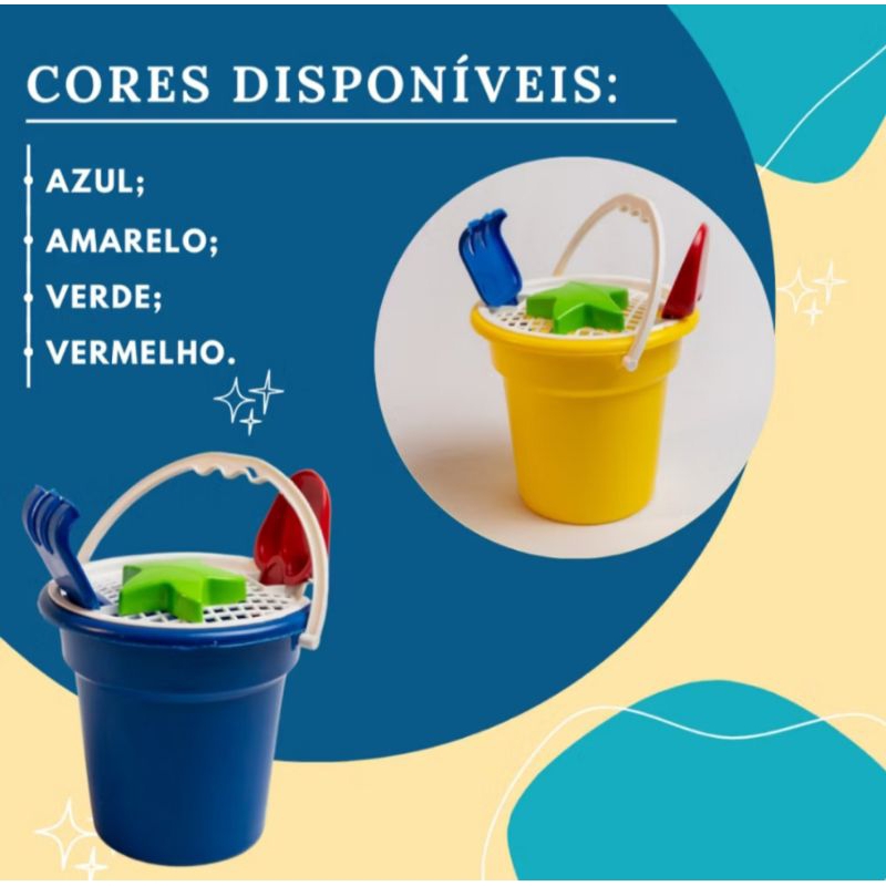 Com o Kit Baldinho, a diversão da criançada na Praia está garantida!! O kit Baldinho contém: - Balde de Praia com Alça - Peneira - Rastelinho - Pazinha - Molde de Estrela *É possível escolher a cor do balde, porém, os demais itens são de cores sortidas