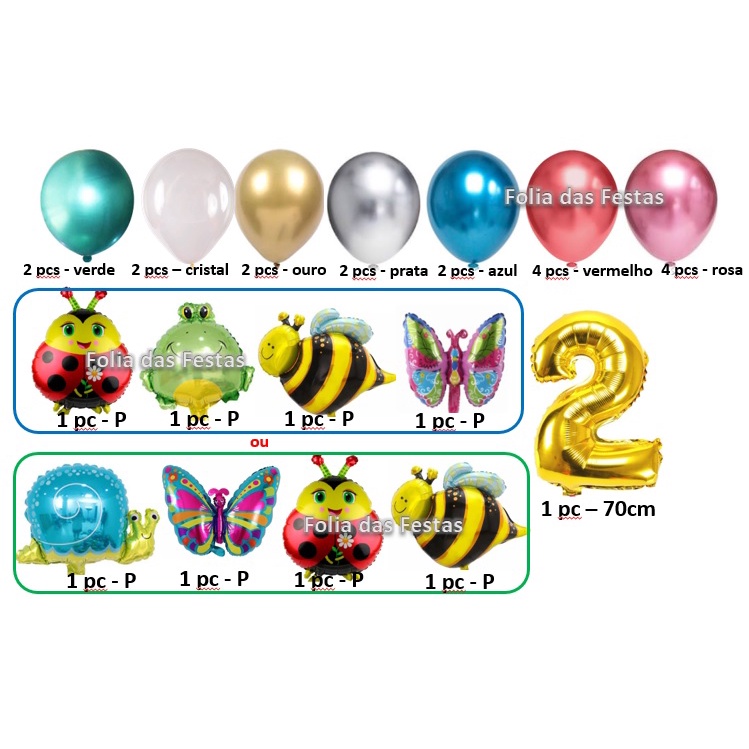 kit balões metalizados +látex - animais Safari, fazendinha, jardim ou dino o kit contém: 1 balão metalizado de 70cm; 4 balões metalizados (P); 18 balões de látex (tamanho 9) - conforme fotos do tema selecionado. * produto enviado vazio e não acompanha vareta ou acessórios para prender ou amarrar. ** balões de látex flutuam se enchidos com gás hélio.