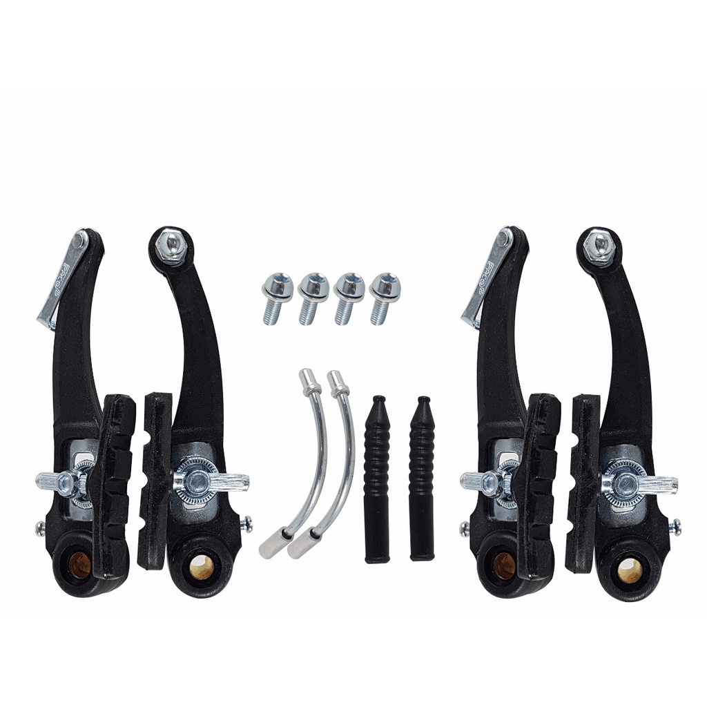 Kit de freio V-Brake para bicicletas aro 16 Kit Composto por: Freio V-Brake dianteiro e traseiro Nylon Par de manopla Borracha Par de Manete de freio Plático Par de conduítes Par de Cabos de aço Par de pedal Plástico Selim Aranha