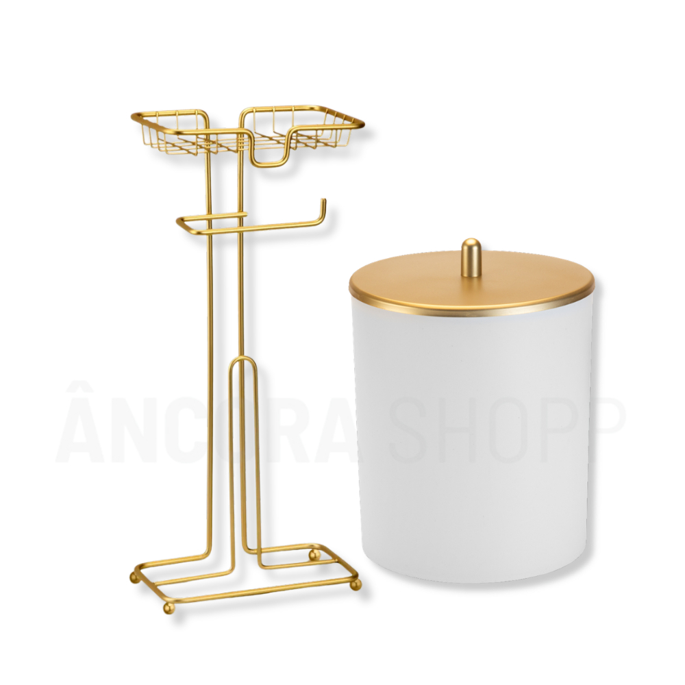 Kit Papeleira de Chão com Prateleira + Lixeira 5L com Tampa Dourada Transforme seu banheiro em um ambiente mais elegante, organizado e funcional com este kit sofisticado. Composto por uma papeleira de chão com prateleira e uma lixeira de 5 litros com tampa dourada, o conjunto une praticidade, beleza e acabamento moderno para valorizar a decoração do espaço. Ideal para quem busca um banheiro mais harmonioso e bem organizado, o kit possui visual refinado e combina facilmente com ambientes modernos, clássicos ou rústicos. Destaques do Kit Acabamento dourado fosco sofisticado, com excelente resistência à umidade Papeleira de chão com capacidade para armazenar até 3 rolos e manter 1 em uso Prateleira superior funcional, ideal para apoiar celular, lenços ou pequenos objetos Lixeira com tampa dourada, que ajuda a manter o ambiente mais limpo e visualmente uniforme Materiais de qualidade: papeleira em aço e lixeira em plástico PSAI resistente Design moderno e elegante, perfeito para compor a decoração do banheiro Dimensões do Produto Papeleira de Chão com Prateleira Altura: 46,3 cm Largura: 13,0 cm Comprimento: 20,5 cm Material: Aço Capacidade: 3 rolos armazenados + 1 em uso Lixeira 5 Litros Altura: 25,0 cm Largura: 19,0 cm Capacidade: 5 litros Material: Plástico PSAI Tampa: Dourada inclusa Conteúdo da Embalagem 01 Papeleira de Chão com Prateleira 01 Lixeira 5 Litros com Tampa Dourada Informações Importantes Garantia de 3 meses contra defeitos de fabricação Valor referente ao kit completo com 2 peças Imagens meramente ilustrativas Não nos responsabilizamos pelo mau uso do produto