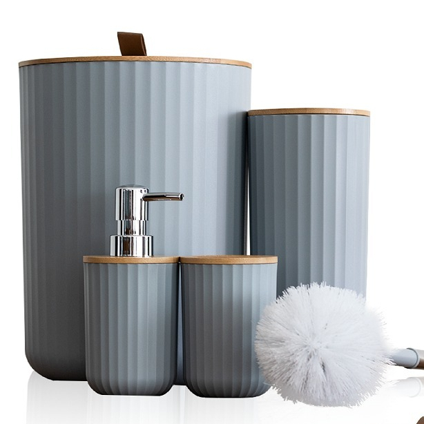 Kit Banheiro 4 Peças Tampa de Bambu Lixeira Escova Sanitária Porta Escovas Design Moderno Luxo