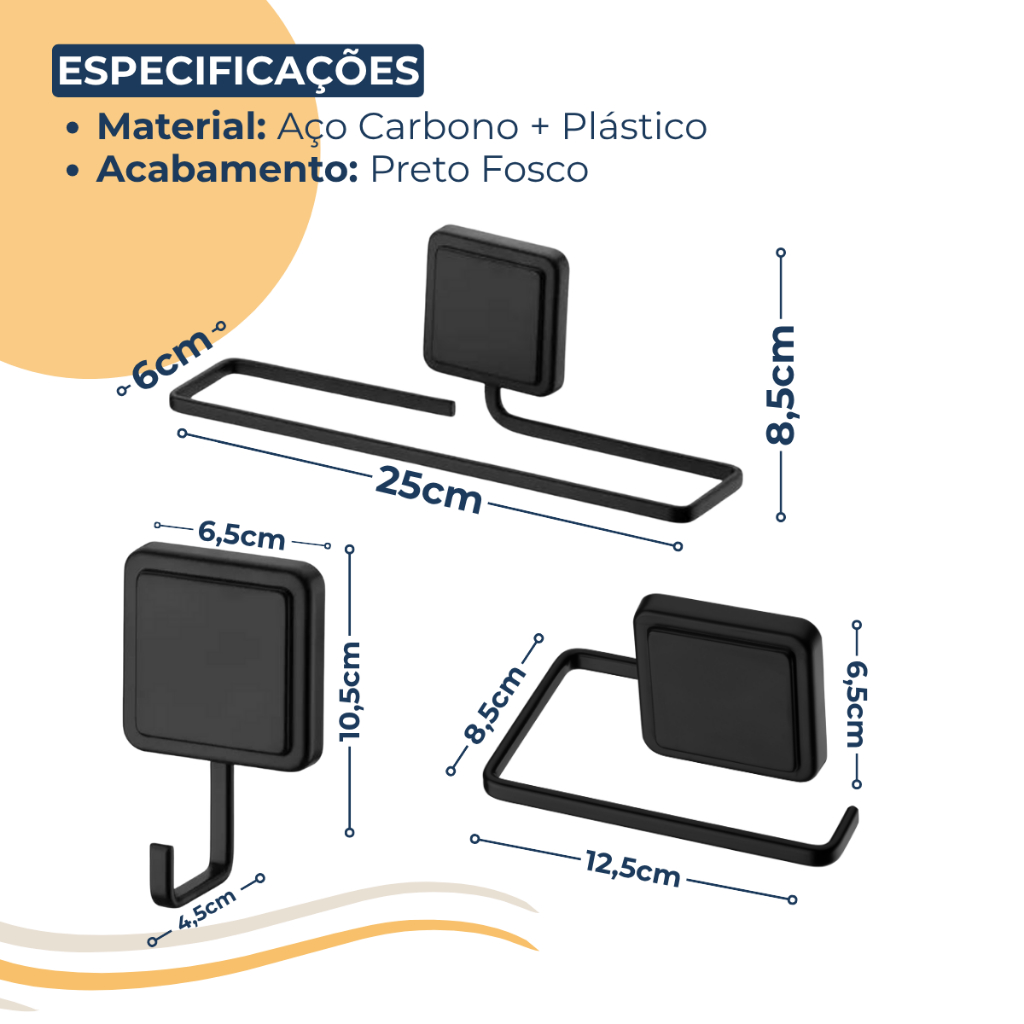 Kit Banheiro Acessórios Preto Fosco 3 Peças Porta Toalha Suporte Papel Higiênico Gancho Adesivo 3M