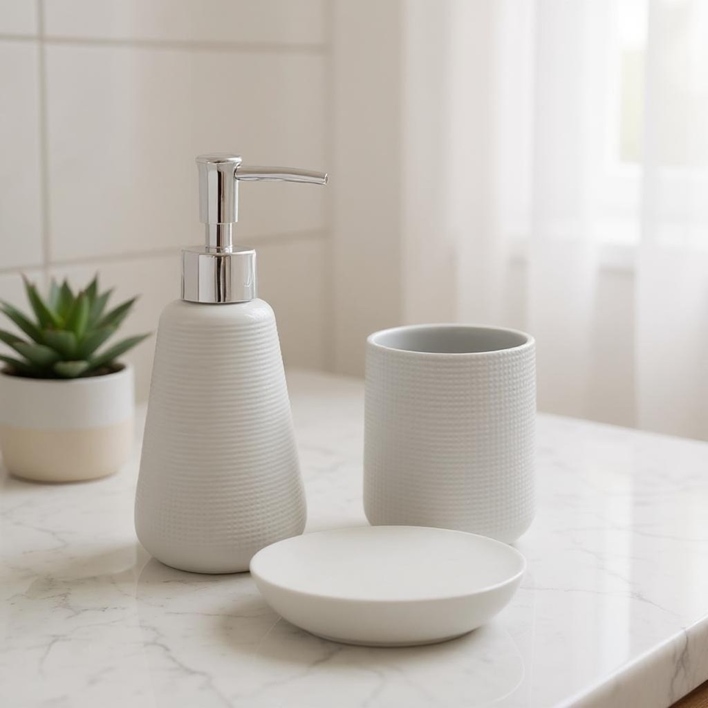 Conjunto para Banheiro Serenus Branco – 3 Peças em Cerâmica Transforme seu banheiro com mais charme, praticidade e organização com o elegante Kit de Banheiro. Com design moderno e acabamento sofisticado, esse conjunto em cerâmica na cor branca traz harmonia e funcionalidade para o seu ambiente. O kit contém: - 1 Dispenser para sabonete líquido – Ø 8cm x 19cm - 1 Pote multiuso – Ø 8,2cm x 10cm - 1 Saboneteira – 13,3cm x 10,1cm x 3cm * Material: Cerâmica de alta qualidade * Ideal para uso diário, o kit combina resistência e estilo para deixar sua bancada mais bonita e organizada. Perfeito para quem busca sofisticação nos detalhes.
