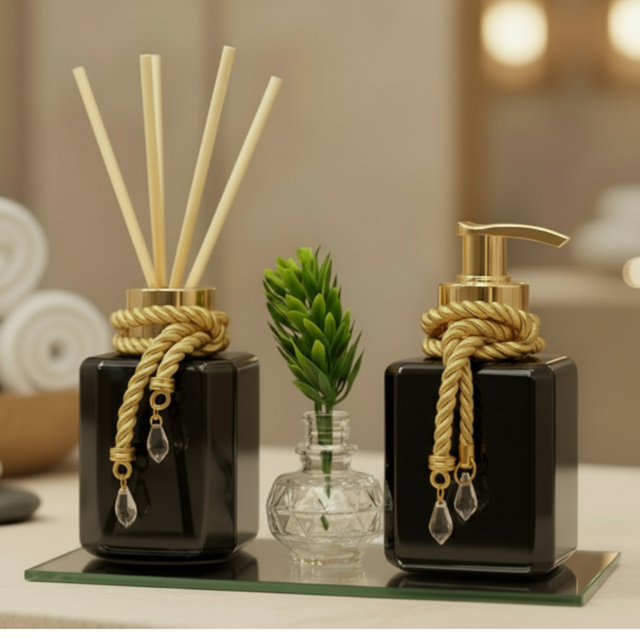 Kit Banheiro Lavabo Completo Aromatizador de Ambiente e Sabonete Líquido (300 ml) Com Bandeja Luxo