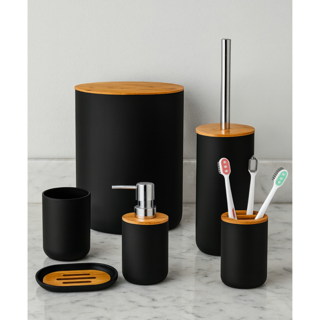 Kit Banheiro Lavabo Escova Lixeira 6 Peças Tampa Bambú