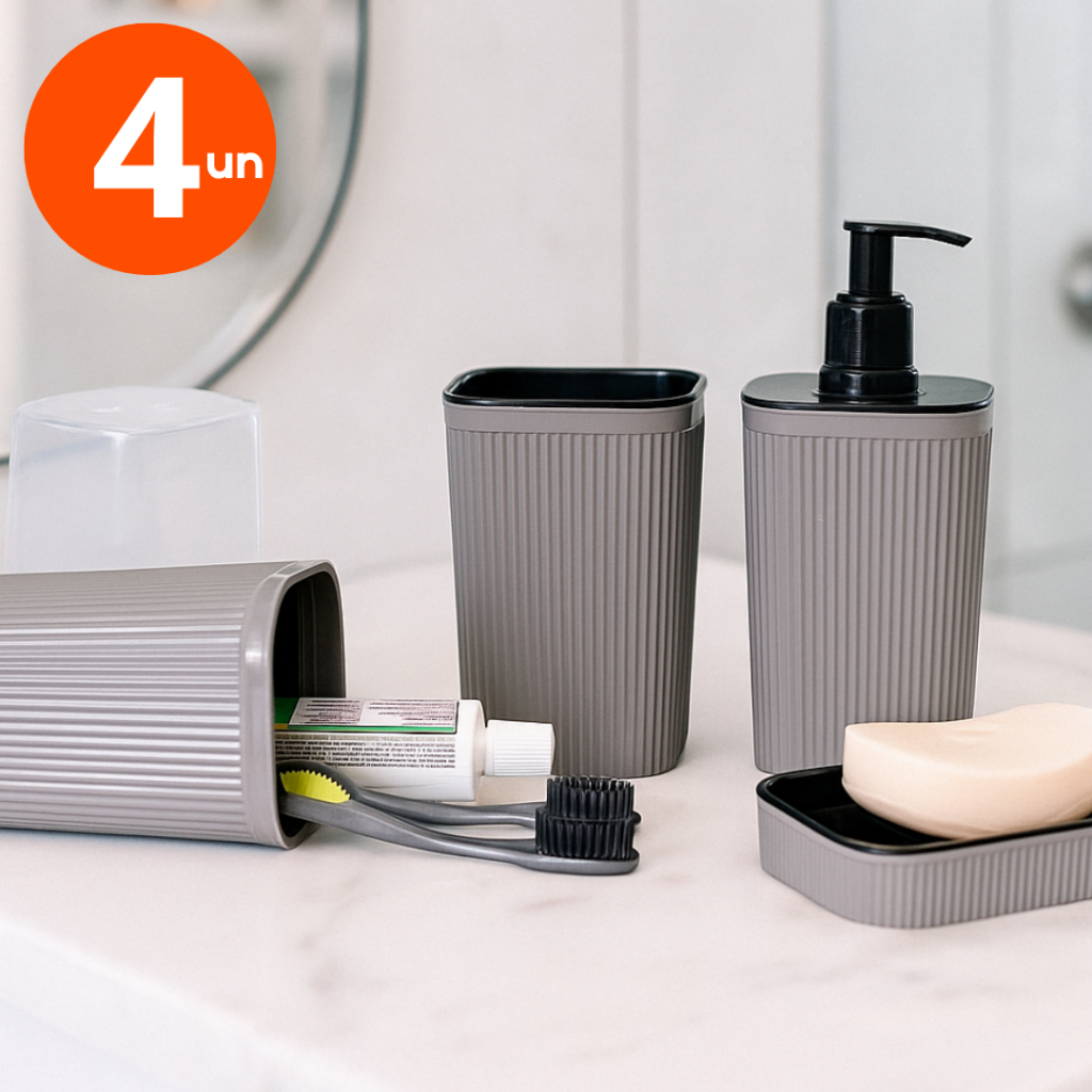 Transforme seu banheiro com este kit completo e moderno da Plasútil! Perfeito para organizar e decorar, une praticidade, resistência e estilo em um só conjunto. Kit Banheiro Completo ou 2 Saboneteiras de Viagem Características: Design elegante que combina com qualquer banheiro Material resistente: Poliestireno de alta qualidade Ideal para deixar o ambiente organizado, higiênico e sofisticado Tamanhos: - Porta Sabonete:7,5x7,5x16,2 cm Capacidade: 420ml - Porta Cotonete e Algodão: 7,5x7,5x11,2 cm Capacidade: 420ml - Porta Escova e Pasta: 7,8x7,8x20,5 cm Capacidade: 380ml - Saboneteira: 10,0x7,6x2,2 cm Capacidade: 30ml - Composição: Plástico. Escolha já o seu e dê um toque de modernidade ao seu banheiro!