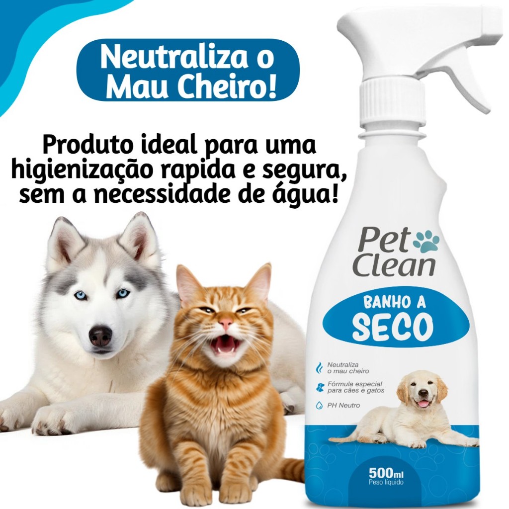 Banho a Seco Spray 500ml – pH balanceado; – Não necessita a utilização de água; – Higiene segura e rápida; – Neutraliza o mau cheiro; – Limpa e perfuma; – Permitido o uso para cães e gatos acima dos 3 meses de idade. Detalhes Elaborado para uma higiene sem água, o Banho a Seco Pet Cleanpara Cães e Gatos possui uma fórmula suave que garante limpeza e suavidade, e tudo isso sem usar água e sem prejudicar ou agredir a saúde do seu amigo. Especialmente elaborado para higienização dos pets principalmente daqueles que dormem com seus donos, ou até mesmo naqueles dias de frio ou chuva que é impossível dar banhos neles. Conteúdo: 500ml Tipo de pet: Cães e Gatos Desembaraçador de Pelos – Ideal para cachorros e gatos com pelos longos; – Contribui para a finalização da escovação, não necessita enxague; – Auxilia na escovação de pelos e remoção de nós; – Contém silicone que garante proteção e causam maciez. Detalhes O Desembaraçador de Pelos Pet Clean é um poderoso desembaraçador que auxilia a escovação de pelos e remoção de nós, promovendo um melhor deslizamento das rasqueadeiras, pentes e escovas. Sua fórmula balanceada para cachorros e gatos contém uma mistura de silicones especiais que além de desembaraçar os pelos formam uma superproteção, causando uma agradável sensação de maciez para o pelo do pet. Conteúdo: 500ml Tipo de pet: Cães e Gatos Kit: 1 Banho a Seco Cães e Gatos 500 ml 1 Desembaraçador de Pelos 500ml