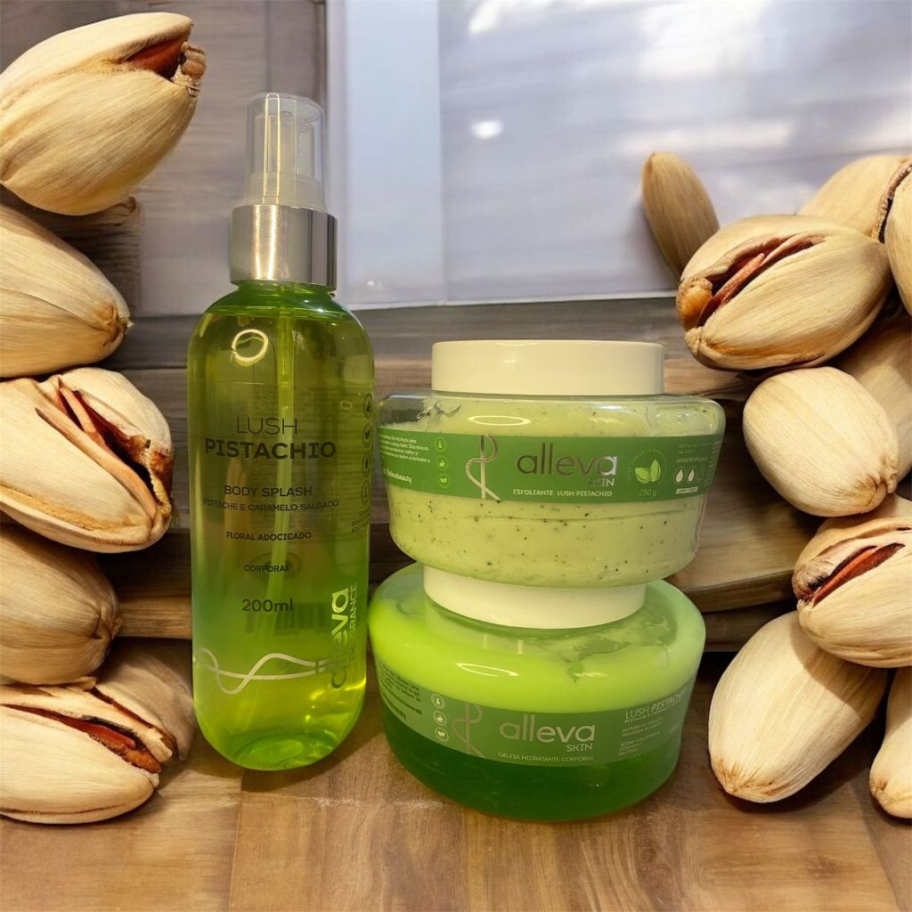 Kit banho Alleva Skin – Esfoliante + Geleia Hidratante + Body Splash Escolha sua fragrância