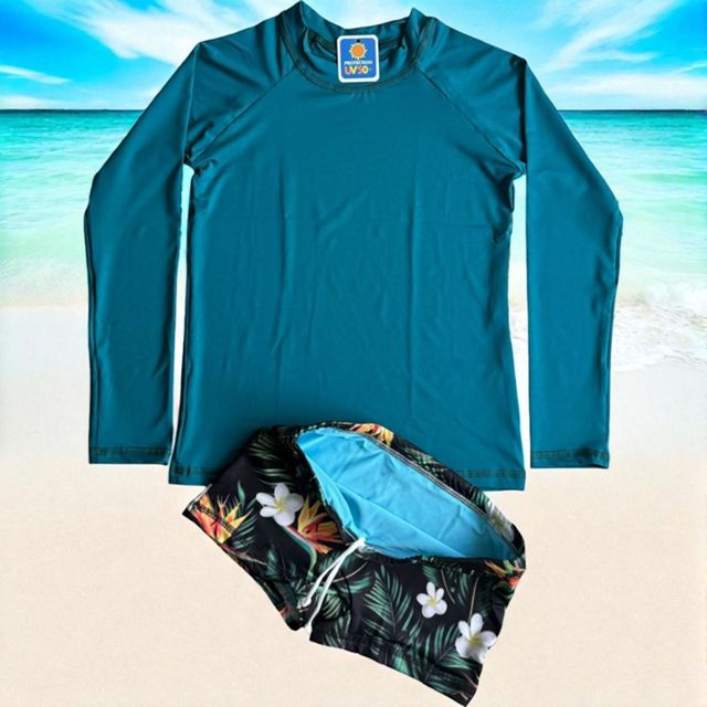 Kit Banho Conjunto Juvenil Infantil Moda Praia Verão Blusa Camisa Manga Longa com Proteção Solar Uv50 e Sunga Infantil