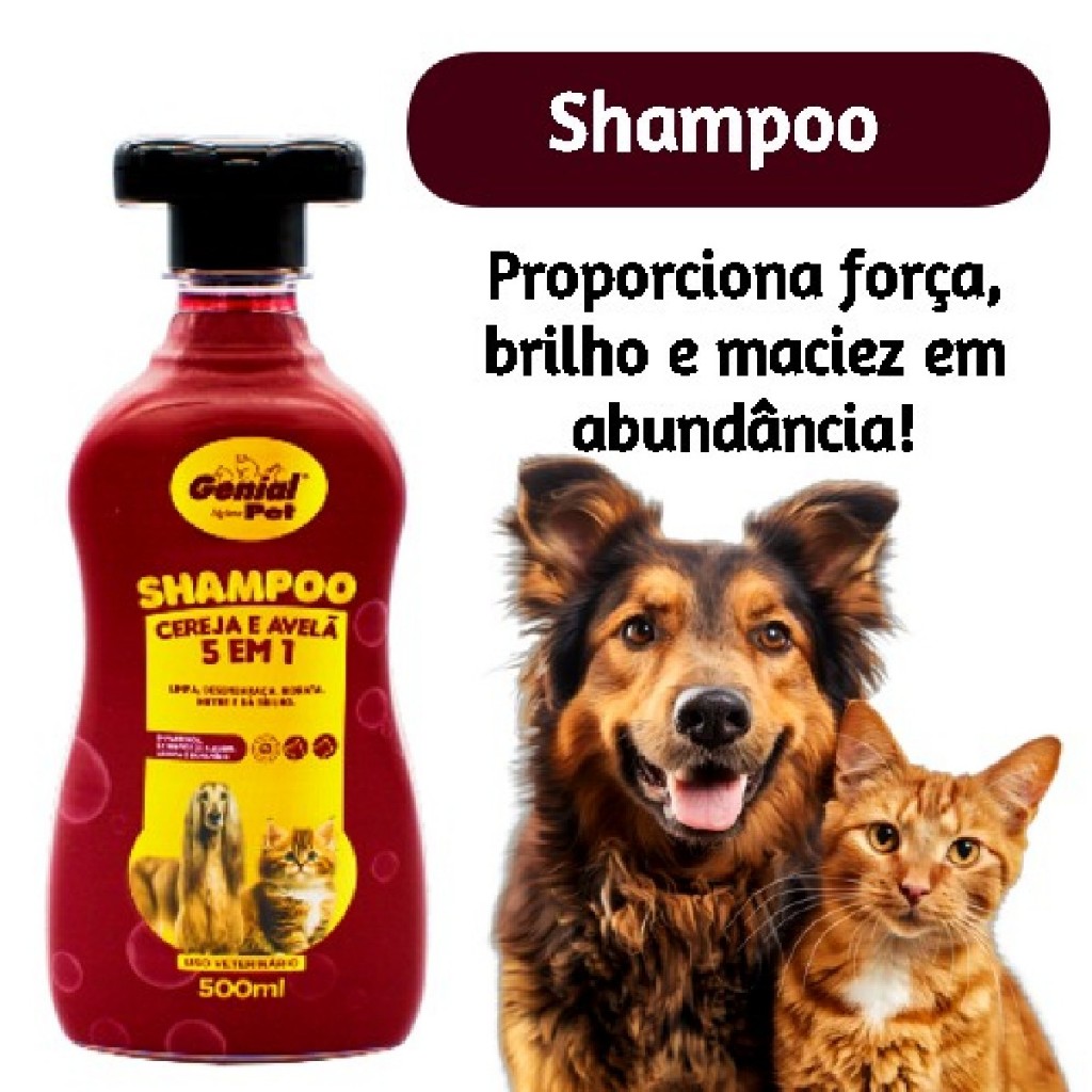 Shampoo Cereja e Avelã 5 em 1 Indicações: O Shampoo Cereja e Avelã 5 em 1 é indicado para todos os tipos de pelos. Possui um conjunto de 03 extratos (Alecrim, Arnica e Hamamélis), cuja função é manter os pelos brilhantes, macios, sedosos e saudáveis. A presença de antioxidantes tornam os pelos fáceis de pentear, com muito mais brilho e força. Em sua fórmula totalmente equilibrada e sinérgica temos a adição de Pró-vitamina B5 (D-Pantenol), que resulta em benefícios poderosos, fazendo toda a diferença para todos os tipos de pelos, prevenindo o ressecamento, reduzindo o frizz, a opacidade e recuperando naturalmente a hidratação. Proporcionando força, brilho e maciez em abundância. Modo de usar: Molhe o animal com água morna, de preferência. Aplique o produto por todo o corpo do animal, evitando a área dos olhos. Massageie até espumar. Enxágue e seque bem os pelos e a pele após o uso do produto. O acúmulo de resíduos contribui para o surgimento de alergias. Condicionador Cereja e Avelã 5 em 1 Indicações: O Condicionador Cereja e Avelã 5 em 1 é indicado para todos os tipos de pelos. Possui um conjunto de 03 extratos (Alecrim, Arnica e Hamamélis), cuja função é manter os pelos brilhantes, macios, sedosos e saúdaveis. Proporcionando um bom condicionamento, desembaraçando, hidratando, nutrindo e deixando os pelos brilhantes. Em sua fórmula totalmente equilibrada e sinérgica temos a adição de Pró-vitamina B5 (D-Pantenol), que resulta em benefícios poderosos, fazendo toda a diferença para todos os tipos de pelos, prevenindo o ressecamento, reduzindo o frizz, a opacidade e recuperando naturalmente a hidratação. Proporcionando força, brilho e maciez em abundância. Modo de usar: Molhe o animal com água morna, de preferência. Aplique o produto por todo o corpo do animal, evitando a área dos olhos. Massageie até espumar. Enxágue e seque bem os pelos e a pele após o uso do produto Deo Colônia Cereja e Avelã 110ml Genial Pet Deo Colônia é um produto indicado para desodorizar e perfumar cães e gatos, mantendo uma fragrância de longa duração. Modo de Usar: Aplique sobre os pelos do animal a uma distância de 10 a 15cm. Massageie os pelos para facilitar a penetração do perfume. Aplicar sempre após o banho com shampoo da linha Genial Pet. - Cheiro Sofisticado - Ótima Fixação - Fragrância De Longa Duração - Produto Original - Perfume muito usado em pet shop por ser uma fragrância sofisticada e de longa duração