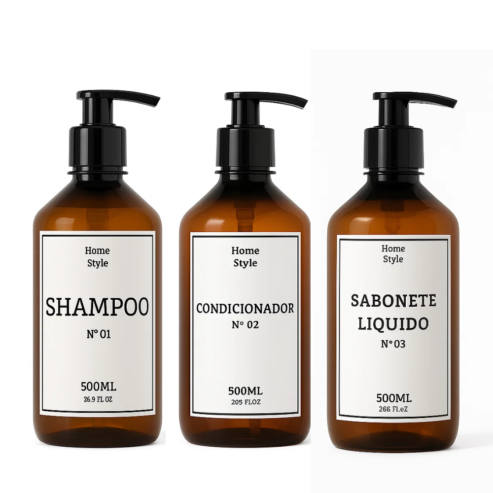 ### Frascos PET Âmbar 500 ml com Válvula Pump Preta O frasco mais resistente do mercado. Produzido em **PET de alta gramatura**, garante **durabilidade, firmeza e acabamento premium**. A tonalidade âmbar é perfeita para quem valoriza cada detalhe da decoração — combina com qualquer estilo, do industrial ao escandinavo. Em qualquer ambiente, nossos frascos acrescentam charme e sofisticação. Ideal para **shampoo, condicionador e sabonete líquido**, o frasco de **500 ml** também funciona como refil, mantendo a bancada organizada e elegante. > *Atenção: vendemos apenas os frascos, sem conteúdo líquido.* **Material:** Plástico PET Acompanha **válvula pump preta** e **rótulo personalizado em vinil à prova d’água**, garantindo durabilidade mesmo em áreas úmidas. **Rótulos disponíveis:** * Shampoo * Condicionador * Sabonete Líquido **Envio rápido:** até **24 h úteis** após a confirmação do pedido. **Conteúdo da caixa:** * 1 frasco PET âmbar para Shampoo * 1 frasco PET âmbar para Condicionador * 1 frasco PET âmbar para Sabonete Líquido