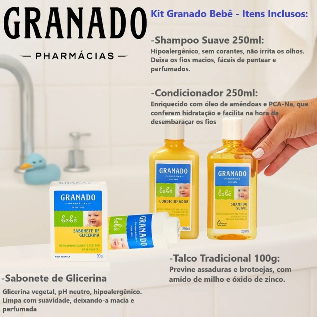 Kit Granado Bebê com 5 Itens – Higiene Completa Tradicional Cuide do seu bebê com a delicadeza que ele merece com este Kit Granado Bebê, ideal para o banho, higiene diária e prevenção de assaduras. Produtos dermatologicamente testados, com a qualidade e tradição da marca Granado. O kit contém: 1 Shampoo Suave Tradicional – 250 ml 1 Condicionador Tradicional – 250 ml 1 Sabonete Barra de Glicerina – 90 g 1 Talco Antisséptico – 100 g 1 Pacote de Lenços Umedecidos – 50 unidades Fragrância: Tradicional / Glicerinado Estado: Produto novo e lacrado Indicado para a pele sensível do bebê, desde recém-nascido Fórmulas suaves, sem corantes e com pH balanceado Benefícios e características da linha Granado Bebê: Produto vegano Livre de crueldade animal (cruelty-free) Dermatologicamente testado Hipoalergênico Sem parabenos Sem corantes Respeita o pH natural da pele do bebê Marca com mais de 150 anos de tradição em cuidado e qualidade Ideal para presentear ou para uso diário! Envio rápido com total segurança. Qualquer dúvida, estou à disposição. Garantia do vendedor: 90 dias