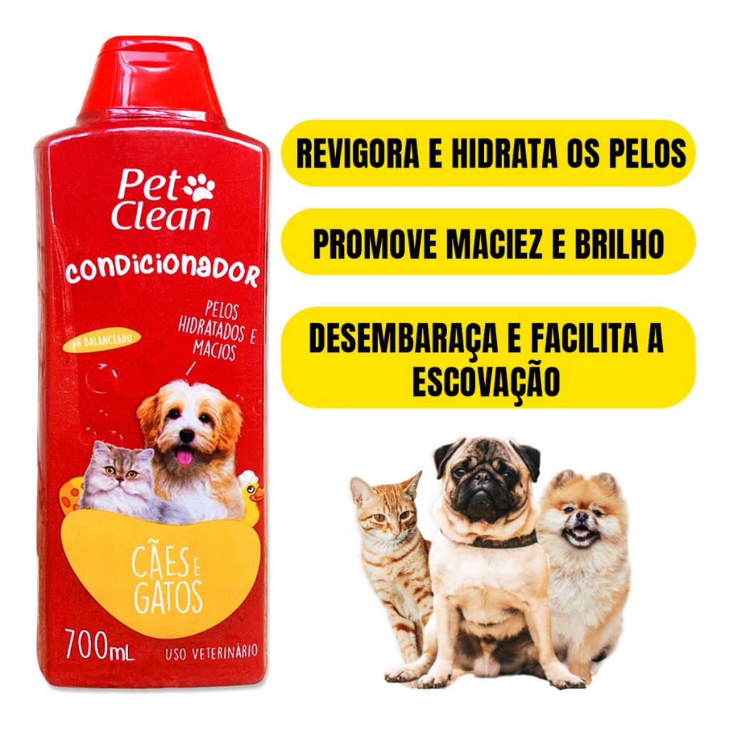 Tudo em um shampoo só! Limpe, condicione, hidrate, revitalize e nutra os pelos do seu amiguinho de quatro patas! Cachorros e gatos limpos e cheirosos são grandes desejos de todos os amantes de animais, não é mesmo? Às vezes ficamos perdidos, entre tantas opções, sobre qual shampoo escolher para darmos um bom banho no nosso peludinho... Esse Kit traz: Limpeza, condicionamento, hidratação e pelos perfumados e é ideal para todos os pelos e pele, sua fórmula neutra e balanceada permite um banho seguro e eficaz para o animalzinho. BENEFÍCIOS DO KIT SHAMPOO NEUTRO, CREME CONDICIONADOR E PERFUME PET CLEAN: -Limpa, condiciona, hidrata, revitaliza e nutre os pelos. -Dispensa o uso de condicionador. -PH Neutro: não agride o animal. -Indicado para todos tipos de cães e gatos. -Pelos macios e cheirosos. INFORMAÇÕES TÉCNICAS: Produto: Shampoo Neutro, Creme Condicionador e Perfume (a escolher) Pet Clean Marca: Pet Clean Tipo: Higiene Animal: Cachorros e Gatos Porte: Pequeno, Médio e Grande. Acima de 2 meses. Raça Específica: Não Sexo Específico: Não Apresentação: Frasco em Plástico Composição: Lauril éter sulfato de sódio, Betaína, Óleo de Amêndoas, Extratos Naturais, Silicone, Agente Condicionante, Metilparabeno, Fragrância, Veículo Q.S.P. MODO DE USAR Aplique o produto no cachorro ou gato ainda molhado e massageie por toda a pelagem do pet até que se forme espuma. Deixe o shampoo agir por alguns minutos e enxágue bem. PRECAUÇÕES Evite contato com os olhos e mucosas do animal. Manter longe de alimentos e produtos domésticos. Manter em locais secos, fora do alcance de crianças e animais domésticos. Não utilizar em filhotes com menos de 2 meses de vida. PERGUNTAS FREQUENTES POSSO USAR O SHAMPOO E CONDICIONADOR DA PET CLEAN EM FILHOTES? Sim! Desde que o filhote tenha mais de 2 meses de vida. Banhos em geral não são recomendados em filhotes com menos de 2 meses, pois, por serem novos, podem ser sensíveis à alguns produtos. O SHAMPOO É APLICADO DA MESMA FORMA PARA CÃES E GATOS? Sim! A aplicação é a mesma para ambos animais. O QUE FAZER SE O SHAMPOO TOCAR OS OLHOS? Se o shampoo vier a tocar os olhos, recomendamos que enxague com água em abundância. Salientamos que o shampoo tem PH neutro, o que não será danoso aos olhos do animal. No entanto, recomendamos sempre evitar o contato do produto com os olhos. POSSO USAR CONDICIONADOR MESMO DEPOIS DE USAR O SHAMPOO ? Sim! Apesar de não ser necessário, pois junto com o shampoo já há condicionador, você pode usar outro condicionador mais específico se desejar!