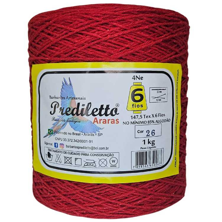 Contém 6 unidades de Barbante Fio 6 de 1kg da marca Prediletto. Para consultar cores disponíveis entre em contato pelo chat. No mercado desde 2006, trazendo um barbante de qualidade, com maciez e cores uniformes! Composição do Barbante: No mínimo 85% algodão 4Ne / 6 Fios 147,5Tex X 6 Fios Agulha recomendada: Crochê 3,5mm | Tricô 4,5mm Em nossa gama de cores, procuramos sempre trabalhar com tons vibrantes para seu artesanato ficar cada vez mais bonito, por isso, deixamos algumas observações: Para evitar manchas em seu trabalho, recomendamos fazer um teste da cor colocando uma pequena quantidade do fio em água com um pouco de sabão neutro. Se a água mudar de cor é um sinal de que ele pode soltar tinta. Caso ocorra soltura da cor, não é recomendado sua utilização com outras cores, pois pode ocorrer a transferência de cor. Recomendamos colocar sal ou vinagre na primeira lavagem para uma maior fixação da cor, pois nas primeiras lavagens pode ocorrer transferência de cor, por isso muito importante não deixar sua peça de molho. Pedimos atenção na hora de lavar seguindo as instruções de tratamento e cuidado para conservação que se encontra no rótulo. OBSERVAÇÕES: * Adquira a quantidade necessária de barbante do mesmo lote para confeccionar sua peça. * Pode haver variação na tonalidade do barbante de acordo com o lote. * Ao finalizar a compra, acompanhe o rastreio da mesma para receber o seu Barbante Prediletto. * Dúvidas? Entre em contato conosco pelo nosso chat. ATENÇÃO!!! Não enviamos para os estados PIAUÍ CEARÁ TOCANTINS MATO GROSSO RIO DE JANEIRO Contato: 19 99961-5456