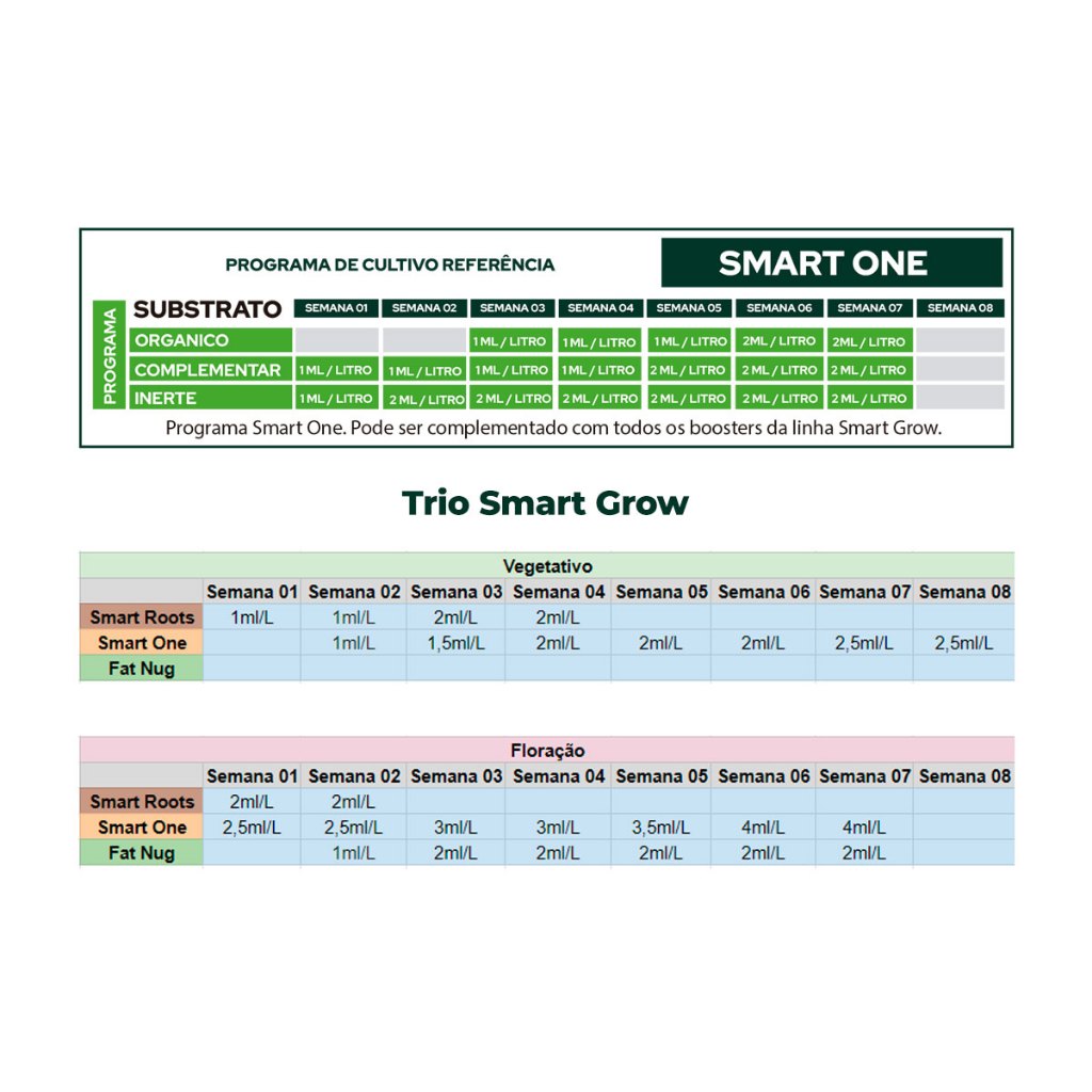 Kit básico contendo 3 fertilizantes da Smart Grow: Smart One, Fat Nug e Smart Roots. Smart One: O fertilizante Smart Grow Smart é a resposta definitiva para uma nutrição simplificada de suas plantas. Com uma fórmula que inclui todas as quantidades ideais de Nutrientes Essenciais (NPK), o Smart One facilita a aplicação, oferecendo uma solução prática e eficiente. Além disso, conta com a presença equilibrada de Micronutrientes e Oligoelementos, proporcionando um manejo descomplicado para o cuidado das suas plantas. Fat Nug: O fertilizante Smart Grow Fat Nug é um “Flower Booster” de última geração, feito para potencializar a fase de floração, em conjunto com nossa linha de Bases Master Bloom, produzindo flores e frutos maiores com colheitas mais estáveis e consistentes. Maximiza o fornecimento de Fósforo (P) e Potássio (K) em doses balanceadas durante o período de desenvolvimento de flores e frutos. Nosso booster líquido foi desenvolvido para suplementar o período do meio ao final da floração. Smart Roots: O fertilizante Smart Grow Smart Roots é um estimulante de raízes de categoria premium, projetado para induzir um enraizamento vigoroso, seja a partir de sementes ou de estacas de matrizes. Sua formulação exclusiva combina bactérias benéficas com extrato de algas de alta qualidade, fonte natural de hormônios vegetais essenciais para a rápida geração e crescimento radicular. O produto oferece um mix de hormônios, nutrientes e vitaminas prontamente assimilados pela planta, favorecendo o desenvolvimento abundante de células radiculares.