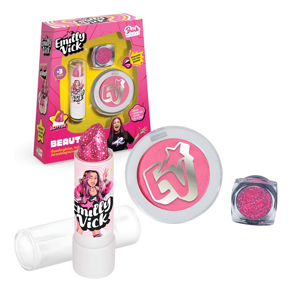 Kit Beauty Mix Emilly Vick Dos Rosa Maquiagem Infantil - Brink Model Um super kit de beleza para as crianças se divertirem com sua youtuber favorita! Se maquie com muito glitter cor de rosa! Esse kit contém: - 1 Blush Rosa - 1 Batom Rosa Com Glitter - 1 Gel Com Glitter Rosa ***Maquiagem para crianças!*** - Dermatologicamente testado - Hipoalergênico - Não testado em animais - Atóxico Sem garantia