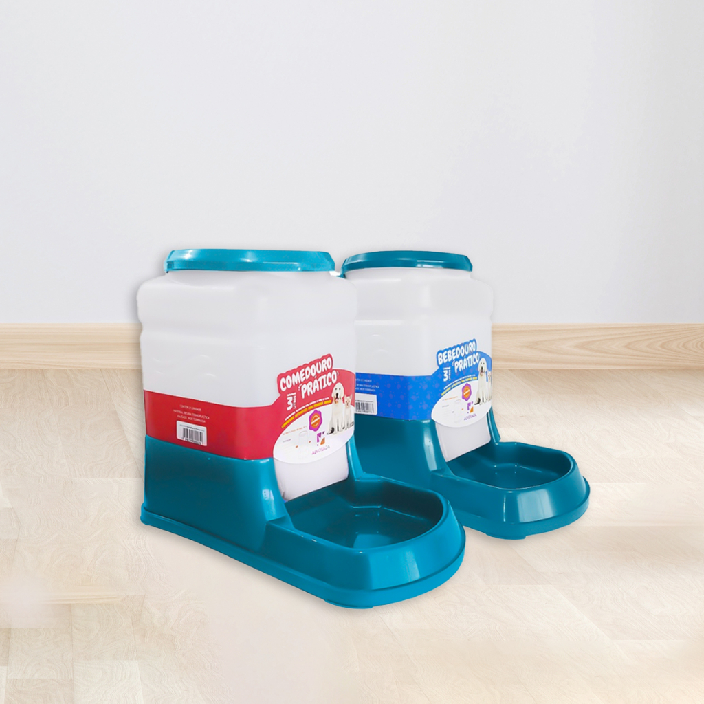 Kit Bebedouro e Comedouro Automático Cachorro Gato Prático 3 Lt Este produto visa facilitar aquelas pessoas que deixam seu cão em casa sozinho por longos períodos. Permite que o alimento seja despejado na medida que o cão o consome. Conteudo: 1 - Bebedouro Automático Prático 3 Lt 1 - Comedouro Automático Prático 2 Kg (A quantidade exata dependerá do grão e densidade da ração) Medidas: 28cm x 16cm x 23 cm x 0,325 kg Obs: Reforçado Capacidade - 3L Cores: Azul, rosa, vermelho.