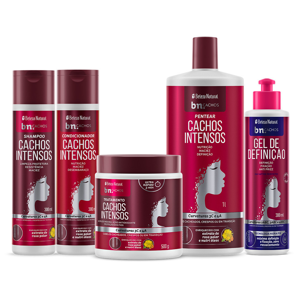 O kit completo bn.CACHOS Intensos, perfeito para curvaturas de 3C a 4A, é composto por:* O Shampoo Cachos Intensos (300ml) promove limpeza suave dos fios sem ressecar. Ele possui em sua formulação Extrato de Rosa Polar, que fornece a resistência necessária para deixar os cabelos mais fortes, saudáveis e macios. É livre de parabenos e óleo mineral.* O Condicionador Cachos Intensos (300ml) possui um mix de óleos e Extrato de Rosa Polar, com ação de longa duração, que selam as cutículas, nutrem e condicionam os fios, facilitando o desembaraço. É livre de parabenos.*O Tratamento Cachos Intensos (500g) possui uma formulação superior que devolve nutrição intensa ao cabelo cacheado, igualando a oleosidade da raiz às pontas. É livre de parabenos. Tem ação ultra rápida, em apenas 3 minutos.* O Pentear Cachos Intensos (1000ml) foi formulado para facilitar o desembaraço, igualar a oleosidade da raiz às pontas e deixar os fios mais resistentes e definidos. É livre de parabenos.* O Gel de Definição bn.CACHOS é ideal para quem busca potencializar a finalização. A Exclusiva Tecnologia Hidra Fix proporciona definição prolongada e fixação sem ressecamento, mantendo o brilho e maciez dos fios. Totalmente liberado e vegano!