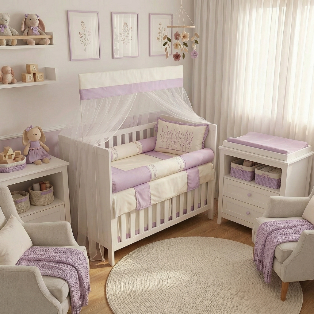 Kit berço completo, ideal para proporcionar conforto e proteção ao bebê. Feito com tecido superior 100% algodão, inclui cabeceira, rolos, bandô, mosquiteiro, lençóis e fronha, garantindo um ambiente aconchegante e seguro. 01 Cabeceira 68cm x 36cm 02 Rolos 1,18m x 18cm 01 Bandô 20cm x 1,37m 01 Mosquiteiro 1,38m x 1,74m 01 Lençol Inferior c/ Elástico 1,37m x 76cm x 9cm (Alt.) 01 Lençol Superior 1,04m x 1,45m 01 Fronha 34cm x 24cm Com Trança 1 Cabeceira bordada 64 x 37 cm 2 laterais 1,37 x 12cm 1 Lençol inferior com elástico 1,37 x 76 x 9 cm 1 Lençol superior com vira 1,45 x 1,04 cm 1 Fronha 36 x 28 cm 1 Mosquiteiro 1,34 x 1,60cm 1 Bandô 1,34 x 18 cm