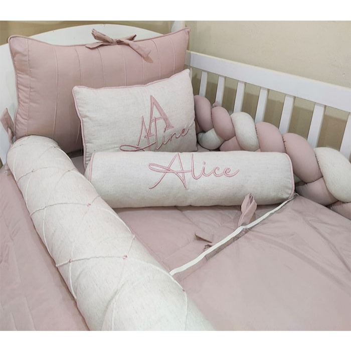Kit Berço Personalizado 6 pçs com 1 Trança - Padrão Americano - Percal 100% Algodão e Linho Palha