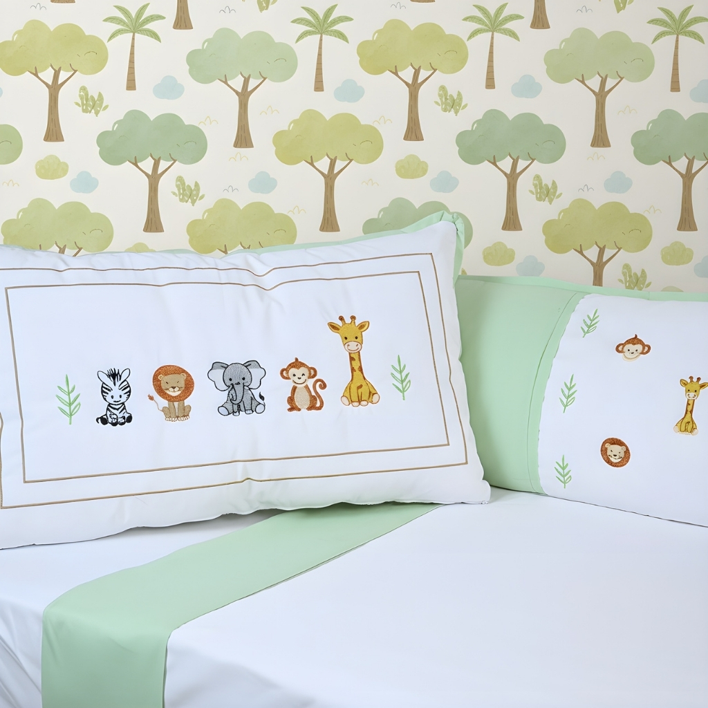 Kit Berço Safari Padrão Americano Algodão Com Mosquiteiro Trança Lençol com Elástico