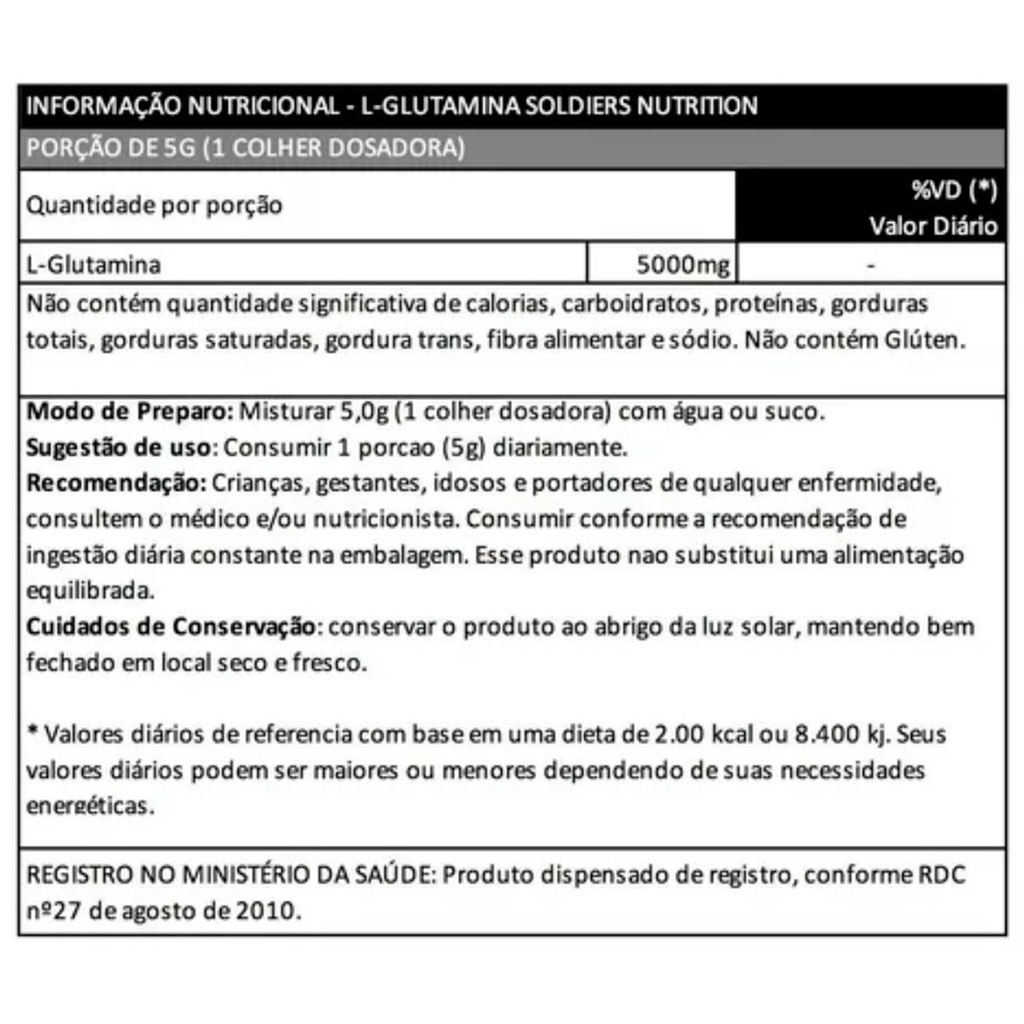 Kit: Beta Alanina 250g + Glutamina 250g - 100% Pura Importada - Soldiers Nutrition ESTE KIT CONTÉM OS SEGUINTES ITENS: - Beta Alanina 250g - Glutamina 250g Beta Alanina 250g - 100% Pura Importada - Soldiers Nutrition Acompanha Colher Dosadora De 3g Benefícios da Beta Alanina: A beta alanina não é benéfica apenas para os exercícios anaeróbicos e de alta intensidade. Ela é bastante útil para pessoas que fazem treinamentos aeróbicos intensos como corridas, ciclismo ou natação. Neste caso também ocorre o aumento da performance do atleta quando ele ingere a suplementação com beta alanina. Glutamina 250g - 100% Pura Importada - Soldiers Nutrition Acompanha Colher Dosadora 5g BENEFÍCIOS DA GLUTAMINA: - Controla o processo de anabolismo e catabolismo; - Removo os excessos de amônia e nitrogênio do corpo; - Regula a síntese e degradação de proteínas; - Regulação do sistema imune. A glutamina participa de forma relevante na síntese de outros aminoácidos e ajuda a manter a homeostase dos tecidos durante o processo de catabolismo. Outras funções importantes inerentes à glutamina é o fato dela conseguir liberar quantidades extras de hormônios na corrente sanguínea, como por exemplo, a testosterona. SOMOS FABRICANTES, PRODUTO DIRETO DA FÁBRICA PARA VOCÊ COM TOTAL GARANTIA DE QUALIDADE ANVISA: Registro ISENTO conforme resolução RDC 27 de 06 de agosto de 2010 anexo I. Registro ISENTO conforme resolução RDC 240/2018.