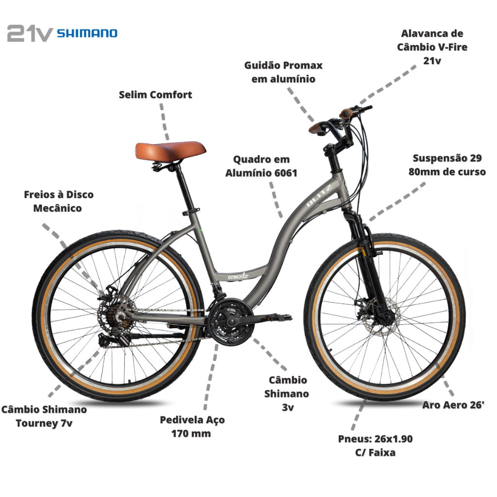 🚲 Descrição Versatilidade, economia e conforto para o seu dia a dia. A BLITZ Comodo 26" é a escolha perfeita para quem busca uma bicicleta versátil, econômica e confiável para se exercitar, passear ou se locomover com praticidade. Indicada para pessoas com altura entre 1,55m e 1,73m, seu tamanho único de quadro e design pensado para oferecer conforto atendem ciclistas de diferentes idades. A postura ereta ao pedalar proporciona estabilidade e controle total, garantindo uma pedalada confortável em trajetos urbanos. O quadro em alumínio combina leveza e resistência, além de possuir um formato ergonômico que facilita a subida e a descida da bicicleta. Equipada com: ✔ Freios a disco, que garantem segurança em qualquer condição. ✔ Suspensão dianteira, que suaviza os impactos do terreno. ✔ Conjunto de câmbio dianteiro e traseiro Shimano com 21 velocidades, para enfrentar subidas, retas e descidas com fluidez. Com a Comodo 26", você tem uma bike prática, econômica e durável, ideal para quem quer mobilidade com estilo e sem complicações. 🛠️ Especificações Técnicas Quadro: Alumínio 6061 com design rebaixado. Suspensão dianteira: Curso de 80 mm. Guidão: Estilo comfort, para postura ereta e maior controle. Freios: A disco mecânico, com acionamento firme e confiável. Trocadores: Importado. Manetes: Integradas ao trocador. Canote do selim: Alumínio 27,2 mm com carrinho ajustável. Transmissão: 21 velocidades. Câmbio traseiro: Shimano Tourney. Câmbio dianteiro: Shimano Tourney. Pedivela: Importado. Corrente: Indexada 7v KMC. Pedais: Plataforma em nylon. Aros: 26" alumínio aero. Cubos: Alumínio com sistema de blocagem rápida. Raios: Pretos, para visual mais moderno. Pneus: 26x1.95 Kenda – visual urbano e ótimo rendimento. Descanso: Alumínio. Peso aproximado: 15 kg. Capacidade de carga: Até 100 kg. Garantia: 5 anos para o quadro e 1 ano para os componentes. 🎁 Conteúdo do Kit Bicicleta BLITZ Comodo 26" Cestinha Retrô Marrom de Nylon, com blocagem rápida Cadeado Reforçado com Chave, cor Preto ❓ FAQ — Blitz Comodo 26" Qual o tamanho do quadro? A Comodo 26" possui tamanho único de quadro, ideal para ciclistas com altura entre 1,55 m e 1,75 m. Para quem a Comodo 26" é indicada? É indicada para quem busca uma bike prática e econômica para deslocamentos urbanos, lazer ou prática de atividade física. Quantas marchas a bicicleta possui? A Comodo 26" possui transmissão Shimano com 21 velocidades, que facilitam o uso em diferentes tipos de terreno. A bicicleta chega montada? Ela é enviada semi-montada, com rodas, selim, pedais e guidão desmontados para facilitar o transporte. A montagem final deve ser feita por um profissional ou oficina especializada. A Comodo 26" aceita acessórios como cadeirinha infantil, bagageiro ou paralamas? Sim. O quadro possui furações compatíveis para instalação desses acessórios, vendidos separadamente. Qual o prazo de garantia? Oferecemos 5 anos de garantia para o quadro e 1 ano para os componentes, contra defeitos de fabricação. Qual a capacidade máxima de carga? A Comodo 26" suporta até 100 kg de carga total (peso do ciclista + acessórios). 🛠️ Informações sobre Montagem e Garantia Montagem Para garantir que a bicicleta chegue intacta até você, o envio é feito com o produto semi-montado. Por isso, recomendamos que a montagem final, bem como a regulagem de câmbios e freios, seja realizada por uma oficina especializada ou profissional qualificado. Garantia A bicicleta possui 5 anos de garantia para o quadro e 1 ano para os componentes, válida exclusivamente para o primeiro proprietário. ⚠️ Importante: A garantia só será aplicada se a montagem e a revisão forem feitas por um profissional ou loja especializada. Itens não cobertos pela garantia: Montagem ou revisão inadequada Mau uso do produto Desgaste natural de peças como: Pneus e câmaras de ar Cabos e conduítes Pastilhas ou sapatas de freio Corrente, engrenagens e componentes da transmissão Centragem dos aros Pintura do quadro Caso tenha qualquer dúvida, nossa equipe está à disposição para te ajudar. Será um prazer esclarecer!