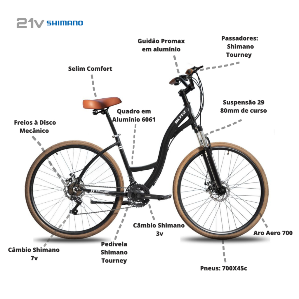 🚲 Descrição Conforto, desempenho e estilo para o seu dia a dia. A Blitz Comodo 29" foi pensada para quem busca uma bike confiável e versátil, ideal para se deslocar com agilidade e conforto no cenário urbano. Suas rodas aro 29" proporcionam uma pedalada mais eficiente e suave, especialmente para pessoas mais altas — com desempenho superior às tradicionais aro 26". O quadro em alumínio combina leveza, resistência e design inteligente, com geometria que facilita o movimento ao subir e descer da bicicleta. Uma escolha prática para a rotina, sem abrir mão do estilo. Disponível em dois tamanhos de quadro, que se adaptam melhor à altura do ciclista: ✔ 16" - indicado para pessoas entre 1,55m e 1,71m ✔ 18" - indicado para pessoas entre 1,72m e 1,87m Equipada com: ✔ Freios a disco, que garantem segurança em qualquer condição. ✔ Suspensão dianteira, que suaviza os impactos do terreno. ✔ Conjunto de transmissão Shimano completo (passadores, pedivela e câmbios) com 21 velocidades, para enfrentar subidas, retas e descidas com fluidez. A postura ereta e o controle total do guidão oferecem uma experiência de pedal confortável, estável e segura — seja para transporte, exercício ou lazer. Cômodo não é só o nome. É a proposta: Mobilidade com estilo e prazer em pedalar. 🛠️ Especificações Técnicas Quadro: Alumínio 6061 com design rebaixado. Suspensão dianteira: Curso de 80 mm. Guidão: Estilo comfort, para postura ereta e maior controle. Freios: A disco mecânico, com acionamento firme e confiável. Trocadores: Shimano Tourney EF-41. Manetes: Integradas ao trocador (alavanca de câmbio Shimano EF-41). Canote do selim: Alumínio 27,2 mm com carrinho ajustável. Transmissão: 21 velocidades. Câmbio traseiro: Shimano Tourney. Câmbio dianteiro: Shimano Tourney. Pedivela: Shimano Tourney TY301. Corrente: Indexada 7v KMC. Pedais: Plataforma em nylon. Aros: 29" alumínio aero, com acabamento resistente. Cubos: Alumínio com sistema de esferas e blocagem rápida. Raios: Pretos, para visual mais moderno. Pneus: 700x38C marrom (Chaoyang) – visual urbano e ótimo rendimento. Descanso lateral: Alumínio. Peso aproximado: 16 kg. Capacidade de carga: Até 100 kg. Garantia: 5 anos para o quadro e 1 ano para os componentes. 🎁 Conteúdo do Kit Bicicleta BLITZ Comodo 29" Cestinha Retrô Marrom de Nylon, com blocagem rápida Cadeado Reforçado com Chave, cor Preto ❓ FAQ — Blitz Comodo 29" 1- A bicicleta é compatível com cadeirinha infantil? Sim. A Comodo 29" aceita cadeirinhas infantis dianteiras e traseiras. Temos modelos compatíveis disponíveis para venda em nossa loja. 2- Qual o tamanho ideal de quadro para minha altura? A Comodo 29" está disponível em dois tamanhos: Quadro 16" — indicado para pessoas entre 1,55 m e 1,71 m. Quadro 18" — indicado para pessoas entre 1,72 m e 1,87 m. 3- Qual a diferença entre a Comodo aro 26" e a Comodo aro 29"? Além do tamanho das rodas, a diferença está nos componentes: A Comodo 29" vem com conjunto Shimano completo: câmbios, pedivela e alavancas de marcha. A Comodo 26" possui apenas os câmbios dianteiro e traseiro Shimano, com os demais componentes de outras marcas. O aro 29 também oferece mais conforto, melhor rolagem e ergonomia para ciclistas mais altos. 4- Qual é a capacidade de carga da bicicleta? A bicicleta suporta até 100 kg de carga total (peso do ciclista + acessórios). 5- A bicicleta chega montada? Ela é enviada semi-montada, com rodas, selim, pedais e guidão desmontados para facilitar o transporte. A montagem final e regulagem devem ser feitas por um profissional ou oficina especializada para garantir segurança e bom desempenho. 6- A bicicleta acompanha manual e nota fiscal? Sim. Todos os nossos produtos são enviados com nota fiscal eletrônica, manual de instruções e termo de garantia. 7- Qual o prazo de garantia? Oferecemos 5 anos de garantia para o quadro e 1 ano para os componentes, contra defeitos de fabricação. 8- É possível instalar bagageiro, paralamas ou suporte para garrafa? Sim. O quadro da Comodo 29" possui furações compatíveis com bagageiros, paralamas e suportes de caramanhola, todos vendidos separadamente. 9- Os pneus são indicados para asfalto ou terra? Os pneus 700x38c têm cravos leves e largura intermediária, ideais para uso urbano e ciclovias, com bom desempenho também em trechos de terra batida. 🛠️ Informações sobre Montagem e Garantia Montagem Para garantir que a bicicleta chegue intacta até você, o envio é feito com o produto semi-montado. Por isso, recomendamos que a montagem final, bem como a regulagem de câmbios e freios, seja realizada por uma oficina especializada ou profissional qualificado. Garantia A bicicleta possui 5 anos de garantia para o quadro e 1 ano para os componentes, válida exclusivamente para o primeiro proprietário. ⚠️ Importante: A garantia só será aplicada se a montagem e a revisão forem feitas por um profissional ou loja especializada. Itens não cobertos pela garantia: Montagem ou revisão inadequada Mau uso do produto Desgaste natural d